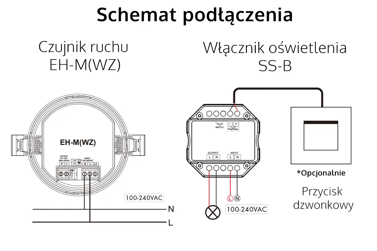 Bezprzewodowy czujnik do LED wykorzystuje technologie mikrofalową MW, która bazuje na wykrywaniu zmian w otoczeniu, emitowanych poprzez fale o wysokiej częstotliwości, by przesłać ten sygnał zdalnie do odbiornika radiowego LED. Naszym odbiornikiem w tym wypadku jest bezprzewodowy włącznik LED, który pozwala na podłączenie dowolnego urządzenia elektrycznego o maksymalnej mocy 360W i napięciu znamionowym 230V Gdy podłączone urządzenie np. lampa LED, otrzyma załączy ją na 100% jasności przez określony czas. Po upływie ustalonego czasu — urządzenie się wyłączy. Warto wspomnieć również że czujnik ruchu EH-M posiada wbudowany czujnik zmierzchu, który blokuje powyższe działanie gdy w pomieszczeniu jest wystarczająco dużo światła. Pamiętajcie jednak by ustalić tryb pracy na czujniku ruchu. Pozwala na to przycisk DIP znajdujący się na obudowie urządzenia. Należy go przestawić w pozycje "SWITCH". Parametry czujnika ruchu EH-M możemy również regulować poprzez potencjometry znajdujące się pod przednią pokrywą urządzenia. Nawet gdy urządzenie jest zainstalowane, łatwo ją można przekręcić i zmodyfikować ustawienia. Istotne jest również, że do zestawu można zakupić pilot radiowy LED bądź panel naścienny LED i zaprogramować go do włącznika oświetlenia SS-B, by uzyskać dodatkowe sterowanie podłączonym oświetleniem LED.