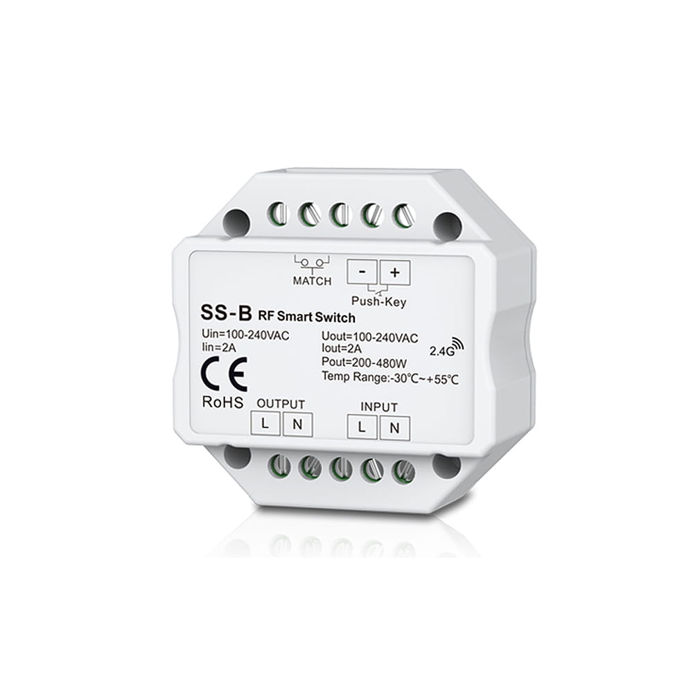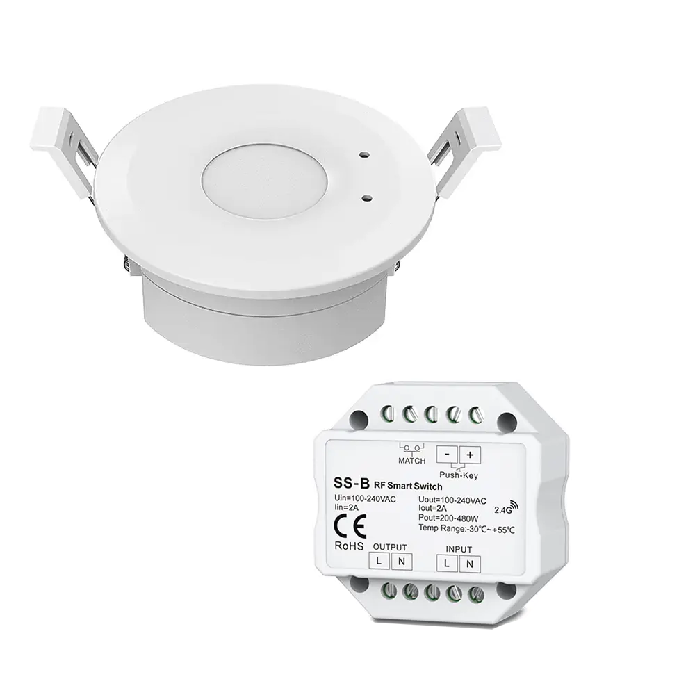 Zestaw bezprzewodowego czujnika ruchu LED Skydance, to gotowy asortyment, składający się z sufitowego czujnika mikrofalowego EH-M oraz włącznika oświetlenia LED 230V SS-B, który umożliwia podłączenie dowolnego urządzenia elektrycznego przeznaczonego na napięcie 230V (np. lampa LED 230V). Sumaryczna moc podłączonego urządzenia elektrycznego nie może przekraczać 360W. Zestaw ten, umożliwia wykrycie ruchu w technologii mikrofalowej i przekazanie sygnału zdalnie do bezprzewodowego wyłącznika LED SS-B. Komunikacja z odbiornikiem jest w pełni bezprzewodowa, ponieważ wykorzystuje sygnał radiowy na poziomie 2,4GHz. Montaż czujnika ruchu obywa się wpustowo, natomiast bezprzewodowy włącznik SS-B należy zamontować w puszce fi60.