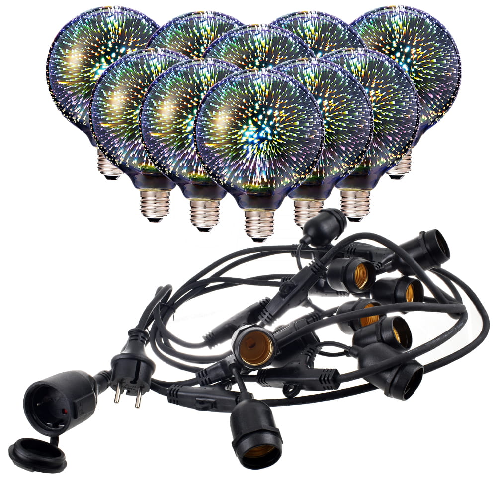 Girlanda wykonana z wysokiej jakości przewodu gumowego o długości 10 metrów z 10 żarówkami dekoracyjnymi LED E27 G125 3W w komplecie. Cechują się solidną konstrukcją oraz wysoką szczelnością (klasa ochronna IP44). Girlanda do żarówek zaopatrzona została w dodatkowe gniazdo pozwalające na łączenie szeregowo kolejnych sznurów świetlnych, co pozwala na dopasowanie długości do panujących potrzeb a ponadto zasilanie z jednego miejsca.