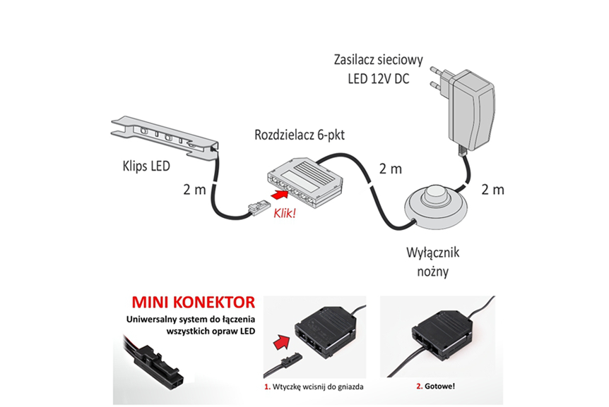 Prezentowane oświetlenie LED posiada system MINI-KONEKTOR, który w znacznym stopniu ułatwia nie tylko podłączenie do zasilania bez konieczności lutowania ale także powiązanie kilku opraw (max. 6 sztuk) do jednego rozdzielacza.