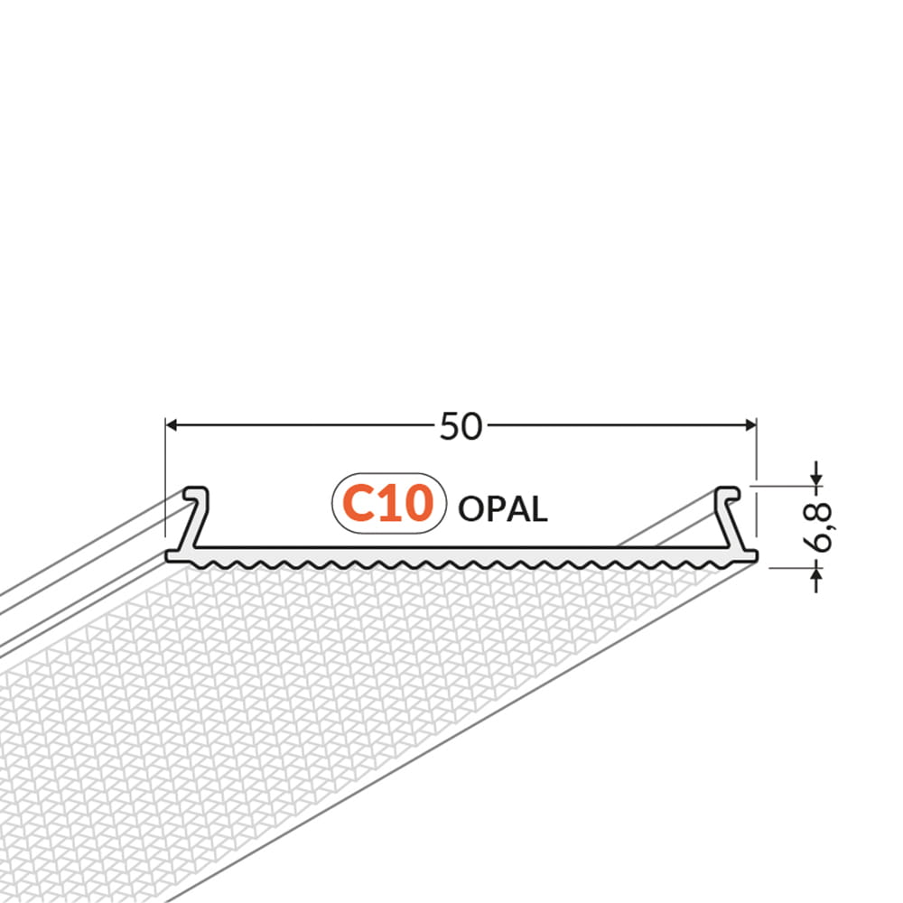 Klosz C10 OPAL to produkt, którego podstawową funkcją jest estetyczne zamknięcie profilu oraz zabezpieczenie go przed czynnikami zewnętrznymi. Klosz zatrzaskowy stosowany jest w przypadkach gdy nie posiadamy miejsca na wsunięcie tradycyjnych kloszy z boku. Klosza nie trzeba wsuwać - wystarczy go tylko wcisnąć, nawet w przypadku już wcześniejszego montażu profilu we wnęce. Zalety tego produktu doceni każdy instalator, który ceni swój czas a zarazem satysfakcję klienta. Racjonalny dobór klosza o odpowiedniej transparentności pozwala na uzyskanie oczekiwanego efektu świetlnego, takiego jak jego rozproszenie czy pochłanianie światła. Wersja OPAL posiada ryflowaną powierzchnię po zewnętrznej stronie.