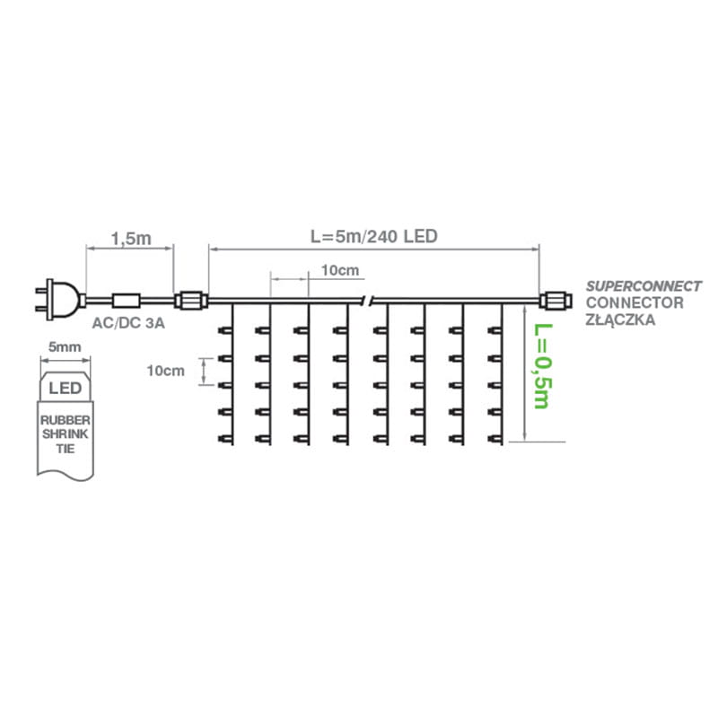 Kurtyna świetlna LED z 240 diodami LED do zastosowania zarówno na zewnątrz jak i wewnątrz z kolekcji srebrnej o długości 5mb z 8 pionowymi zwisami o długości 0.5mb. Kurtyny LED znajdują zastosowanie szczególnie do ozdabiania elewacji, okien, balkonów, tarasów, dachów oraz aranżacji wewnętrznej i zewnętrznej. Kurtynki LED na całej swej długości mają ułożone pionowo sznury z diodami LED.