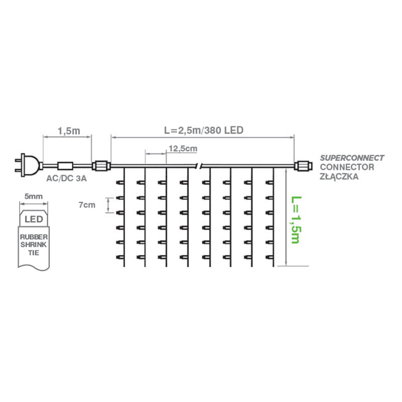 Kurtyna świetlna LED z 380 diodami LED do zastosowania zarówno na zewnątrz jak i wewnątrz z kolekcji srebrnej o długości 2,5mb z 20 pionowymi zwisami o długości 1,5mb. Kurtyny LED znajdują zastosowanie szczególnie do ozdabiania elewacji, okien, balkonów, tarasów, dachów oraz aranżacji wewnętrznej i zewnętrznej. Kurtynki LED na całej swej długości mają ułożone pionowo sznury z diodami LED.