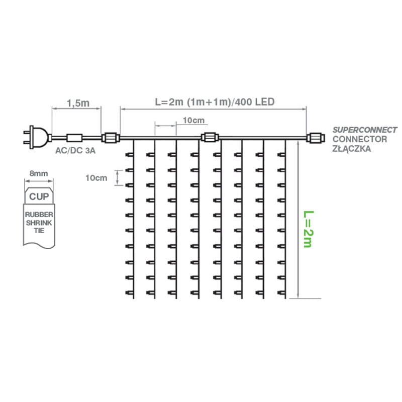 Poprzez zastosowanie wysokiej jakości diod LED kurtyny świetlne LED cechują się znikomym poborem mocy oraz długą żywotnością. Zakończone są hermetycznym gniazdem 230V dzięki czemu istnieje możliwość podłączenia do 6 zestawów.