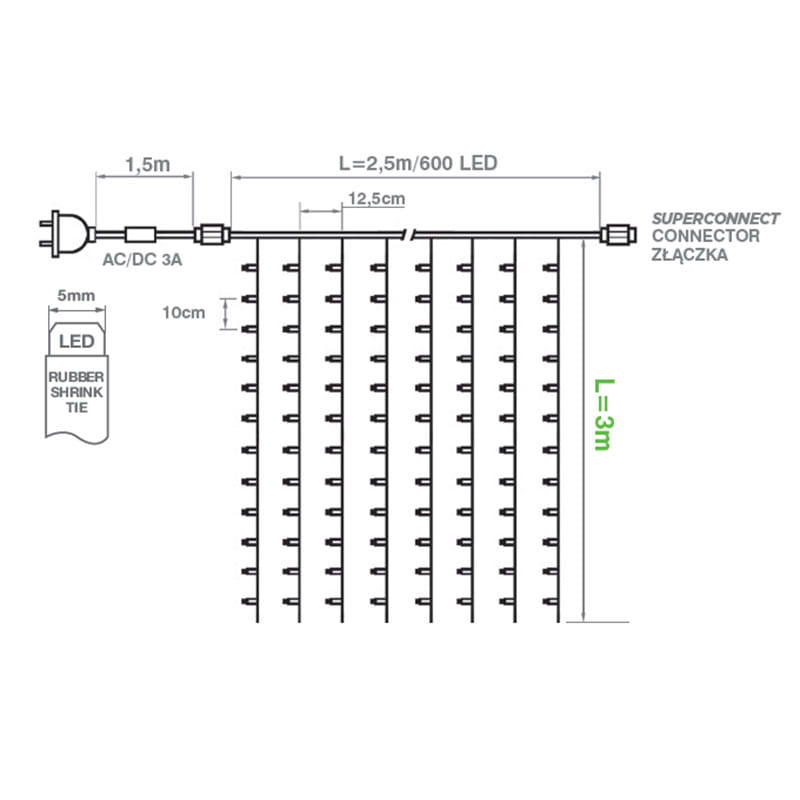 Kurtyna świetlna LED z 600 diodami LED do zastosowania zarówno na zewnątrz jak i wewnątrz z kolekcji srebrnej o długości 2,5mb z 20 pionowymi zwisami o długości 3mb. Kurtyny LED znajdują zastosowanie szczególnie do ozdabiania elewacji, okien, balkonów, tarasów, dachów oraz aranżacji wewnętrznej i zewnętrznej. Kurtynki LED na całej swej długości mają ułożone pionowo sznury z diodami LED.