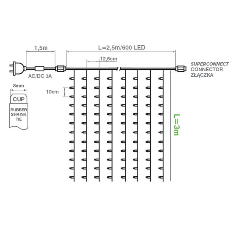 Poprzez zastosowanie wysokiej jakości diod LED kurtyny świetlne LED cechują się znikomym poborem mocy oraz długą żywotnością. Zakończone są hermetycznym gniazdem 230V dzięki czemu istnieje możliwość podłączenia do 4 zestawów.