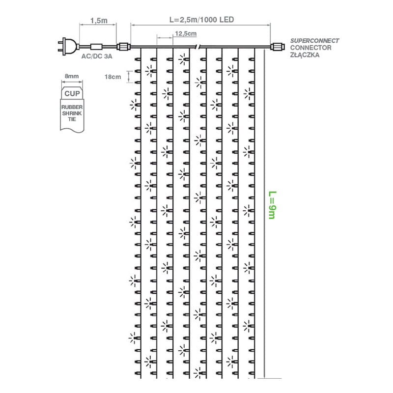 Poprzez zastosowanie wysokiej jakości diod LED kurtyny świetlne LED cechują się znikomym poborem mocy oraz długą żywotnością. Zakończone są hermetycznym gniazdem 230V dzięki czemu istnieje możliwość podłączenia do 1 zestawu.
