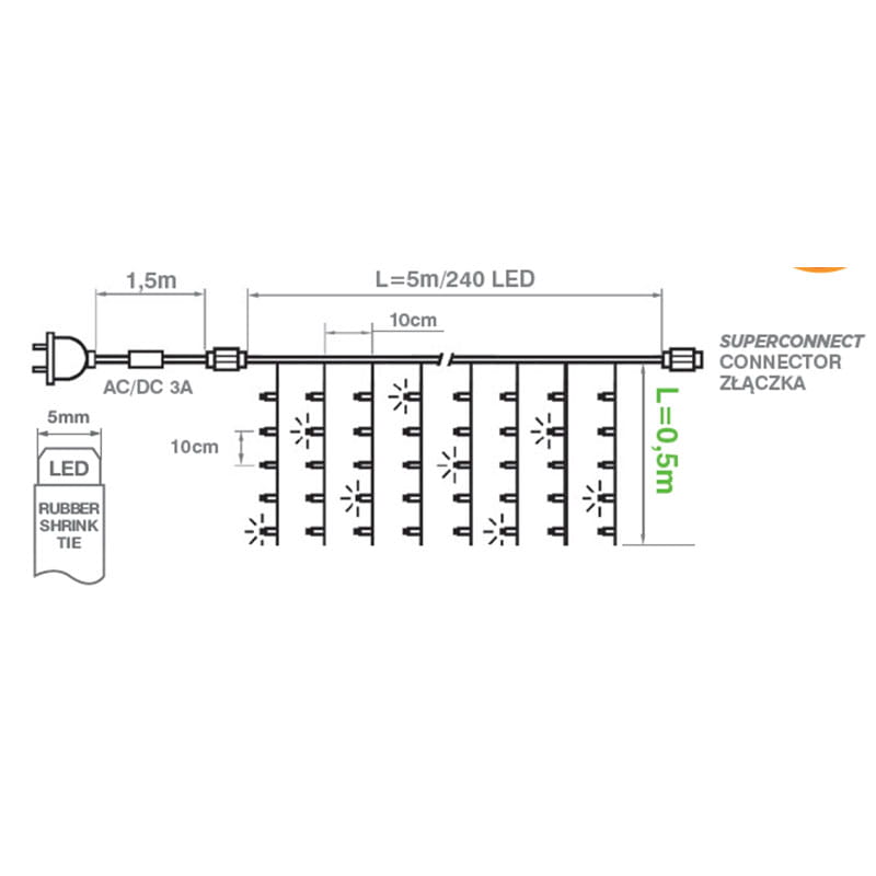 Poprzez zastosowanie wysokiej jakości diod LED kurtyny świetlne LED cechują się znikomym poborem mocy oraz długą żywotnością. Zakończone są hermetycznym gniazdem 230V dzięki czemu istnieje możliwość podłączenia do 5 zestawów.