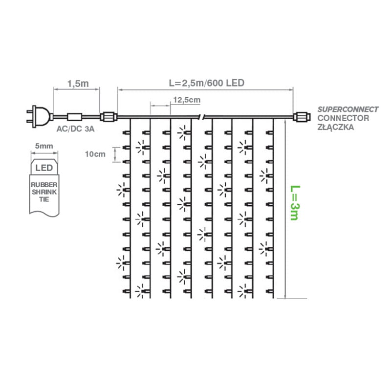Poprzez zastosowanie wysokiej jakości diod LED kurtyny świetlne LED cechują się znikomym poborem mocy oraz długą żywotnością. Zakończone są hermetycznym gniazdem 230V dzięki czemu istnieje możliwość podłączenia do 4 zestawów.