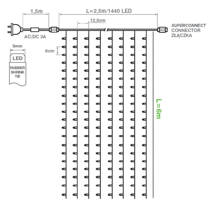 Kurtyna świetlna LED do zastosowania zarówno na zewnątrz jak i wewnątrz z kolekcji srebrnej z 1440 diodami LED o wymiarach 2,5x6mb. Kurtyny LED znajdują zastosowanie szczególnie do ozdabiania elewacji, choinek, drzew oraz aranżacji wewnętrznej i zewnętrznej.