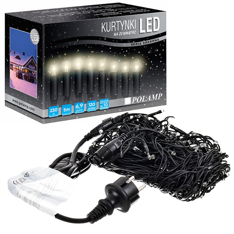 Kurtynka świetlna LED typu "Sople" do zastosowania zarówno na zewnątrz jak i wewnątrz z kolekcji srebrnej z 120 diodami LED o długości 5mb. Kurtyny LED znajdują zastosowanie szczególnie do ozdabiania elewacji, okien, balkonów, tarasów, dachów oraz aranżacji wewnętrznej i zewnętrznej.