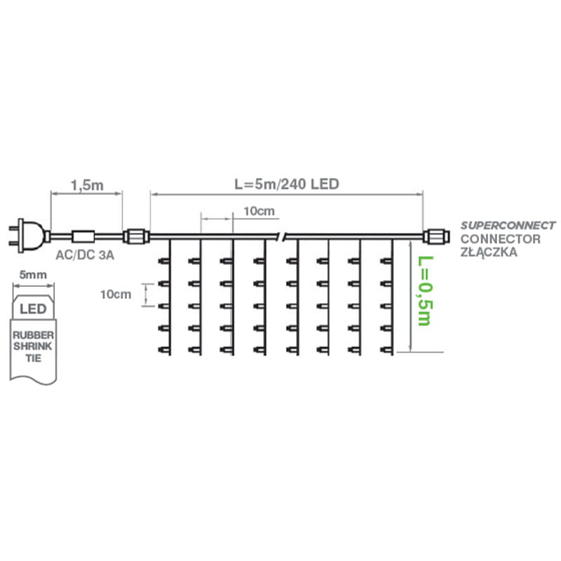 Poprzez zastosowanie wysokiej jakości diod LED kurtyny świetlne LED cechują się znikomym poborem mocy oraz długą żywotnością. Zakończone są hermetycznym gniazdem 230V dzięki czemu istnieje możliwość podłączenia do 4 zestawów.