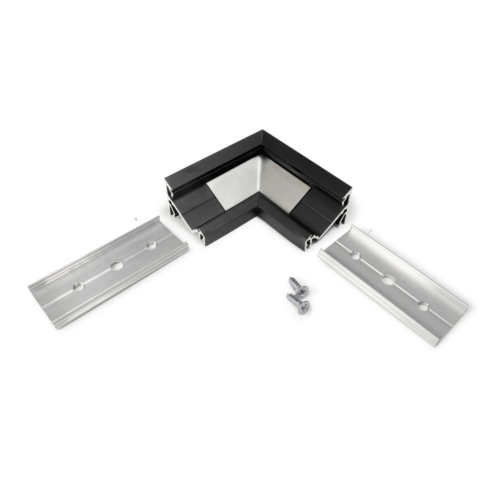 Łącznik wykonany z aluminium anodowanego w kolorze czarnym, służący do łączenia kątowego (90°) profilu aluminiowego LED CORNER14. Wyrób stanowi doskonałe rozwiązanie, gdzie konieczne jest połączenie dwóch profili aluminiowych w kąt prosty. To idealna alternatywa zwiększająca zakres montażu profilu aluminiowego LED. Produkt dzięki dołączonym łącznikom "T" oraz wkrętom pozwala na łatwy, szybki i stabilny montaż.