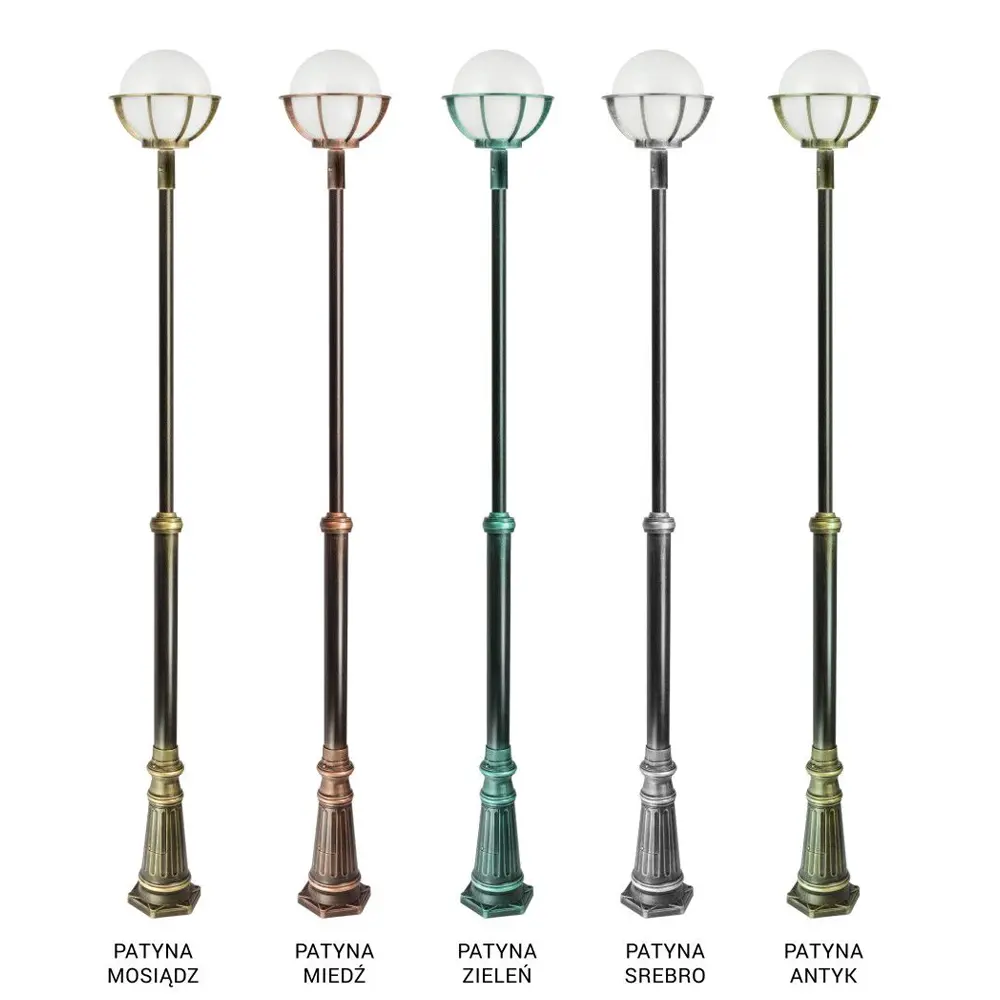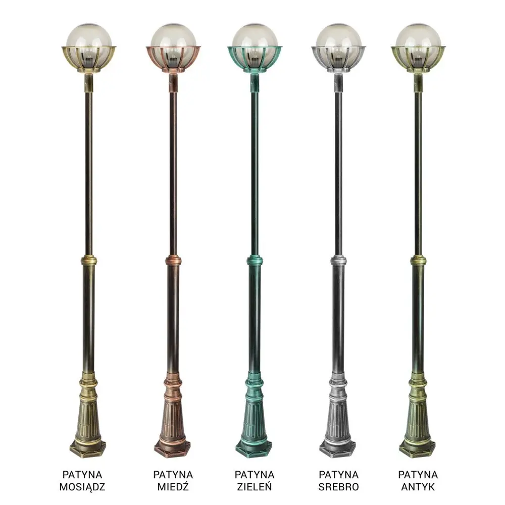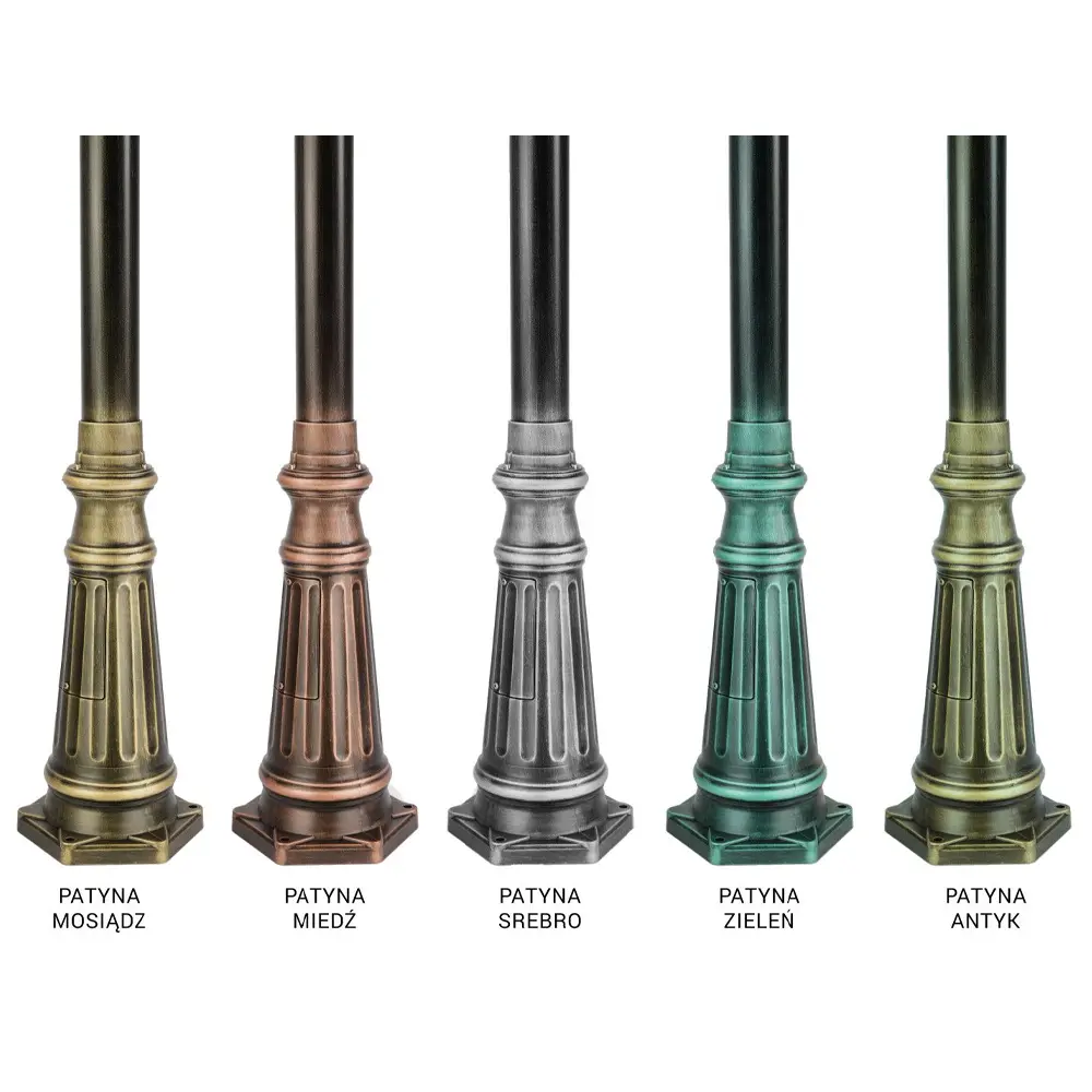 Lampy ogrodowe elewacyjne, stojące, wiszące oraz głowice serii KULE oprócz podstawowej czarnej wersji posiadają także możliwość wykonania oprawy w sześciu wariantach kolorystycznych patyn ( mosiądz, srebro, miedź, zieleń oraz antyk). Zastosowanie takiego rozwiązania wyróżnia nasze lampy ogrodowe na tle innych, dostępnych na rynku, dodając im przy tym atrakcyjności i chrakternego, nieszablonowego wyglądu. To innowacyjne rozwiązanie pozwala na lepsze i bardziej sprecyzowane dopasowanie lampy do otoczenia oraz obowiązującej architektury. Oprawy wykonane z opcjonalnych patyn dostępne są na zamówienie z wyborem koloru w liście rozwijalnej powyżej " kolor lampy".