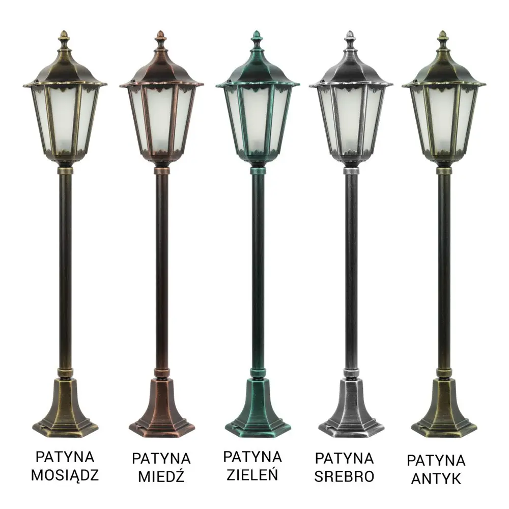 Lampy ogrodowe elewacyjne, stojące, wiszące oraz głowice serii RETRO CLASSIC oprócz podstawowej wszechobecnej czarnej wersji posiadają także możliwość wykonania oprawy w sześciu wariantach kolorystycznych patyn ( mosiądz, srebro, miedź, zieleń oraz antyk). Zastosowanie takiego rozwiązania wyróżnia nasze lampy ogrodowe na tle innych, dostępnych na rynku, dodając im przy tym atrakcyjności i chrakternego, nieszablonowego wyglądu. To innowacyjne rozwiązanie pozwala na lepsze i bardziej sprecyzowane dopasowanie lampy do otoczenia oraz obowiązującej architektury. Oprawy wykonane z opcjonalnych patyn dostępne są na zamówienie z wyborem koloru w liście rozwijalnej powyżej " kolor lampy".