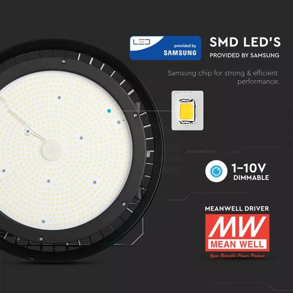 W lampie HighBay LED umieszczony został wysokiej jakości zasilacz firmy MEAN WELL cechujący się znakomitymi parametrami. Ponadto zastosowany zasilacz umożliwia ściemnianie oprawy w systemie 1-10V.