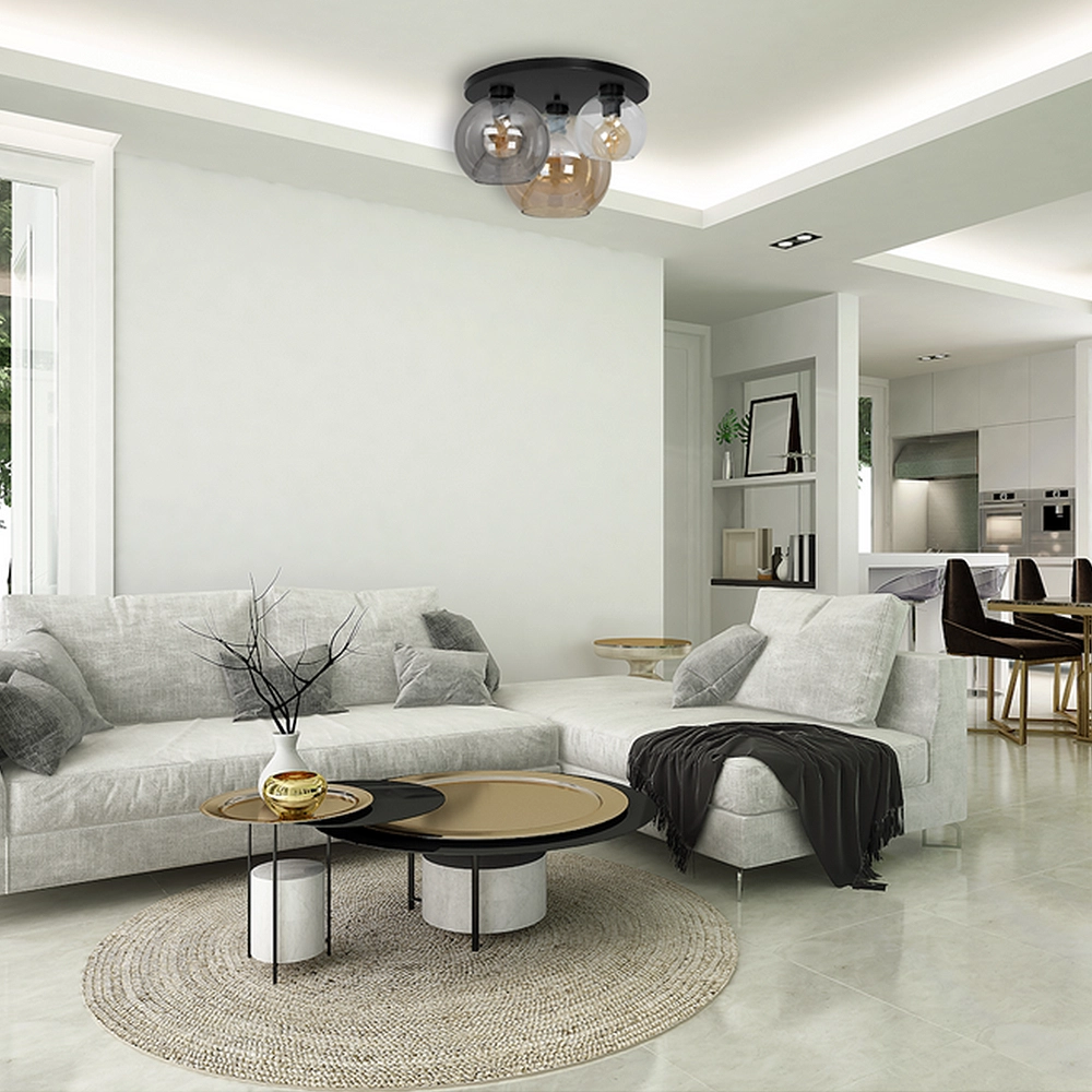 - Unikalna dynamika światła (Efekt Mix): Dzięki trzem różnym kloszom uzyskujesz unikalny efekt wizualny. Klosz Clear zapewnia maksymalną jasność, Amber ociepla barwę światła, a Smoked dodaje elegancji i głębi. To oświetlenie, które nigdy się nie nudzi.