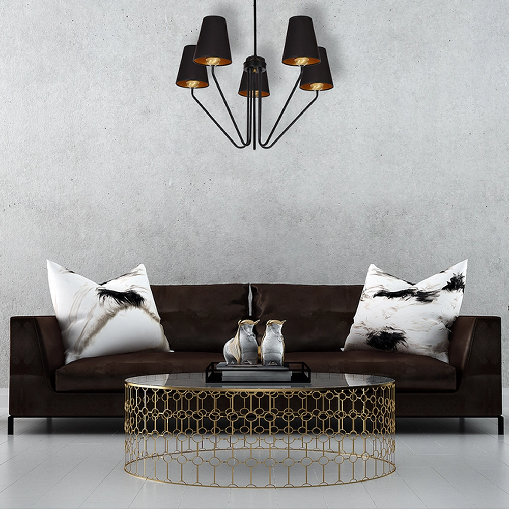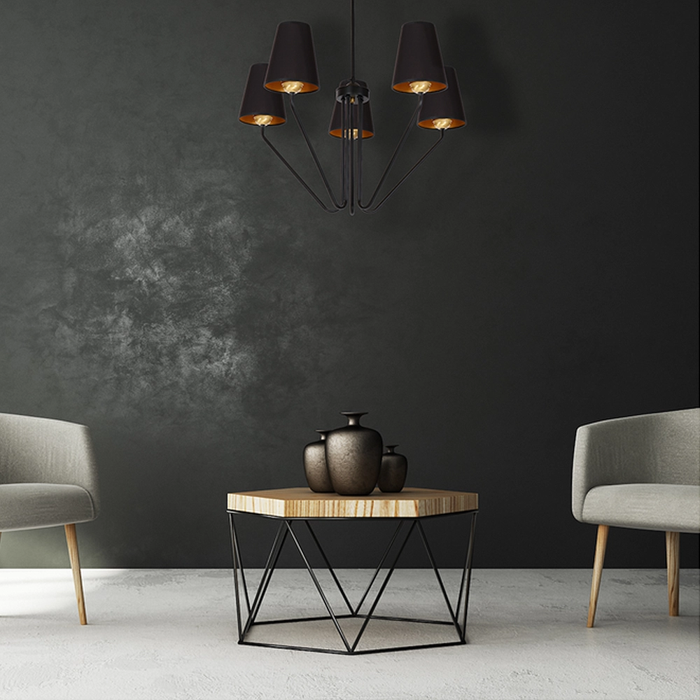 - Reprezentacyjny Salon: Dzięki pięciu źródłom światła, lampa Victoria bez problemu doświetli przestrzeń o powierzchni nawet 20-25 m². Czarna kolorystyka doskonale kontrastuje z jasnymi sufitami, nadając wnętrzu charakteru w stylu nowoczesnym lub loftowym.