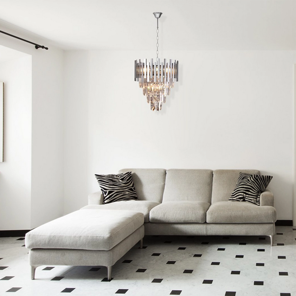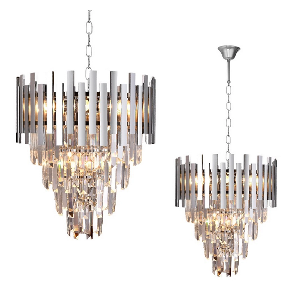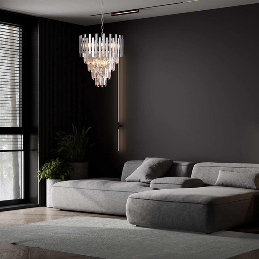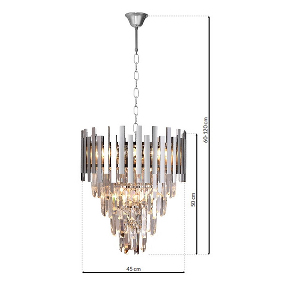 Kaskadowy układ kryształów pięknie rozprasza światło, dzięki czemu lampa ASPEN 9xE14 efektownie oświetla pomieszczenie i wprowadza nastrojowy klimat. Wysokiej jakości materiały – metal oraz kryształowe elementy – gwarantują trwałość, odporność na uszkodzenia i niezmienny wygląd przez długie lata użytkowania. Chromowane elementy odbijają światło, wzmacniając efekt elegancji i nowoczesności, co sprawia, że lampa doskonale pasuje zarówno do klasycznych, jak i nowoczesnych aranżacji wnętrz.