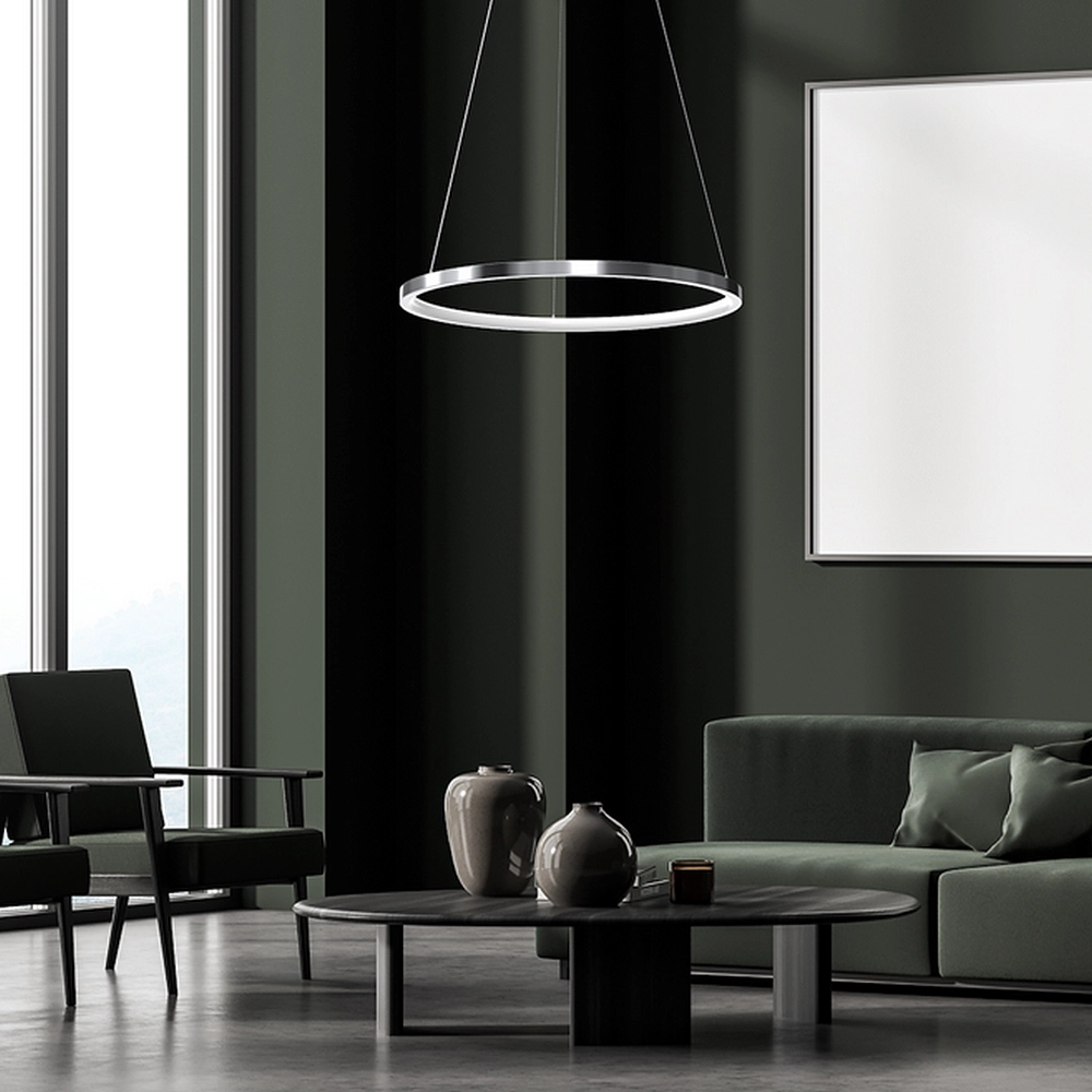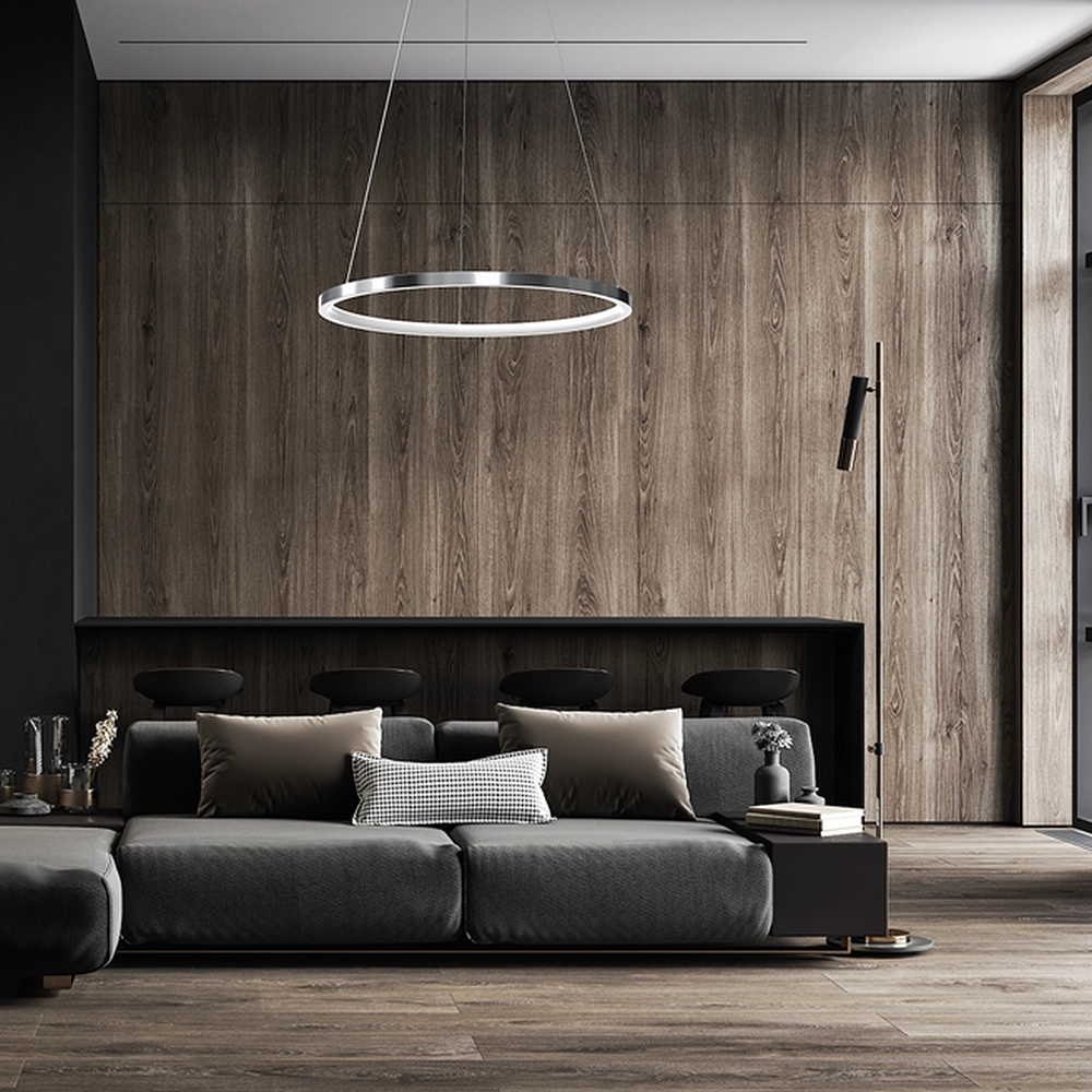 - Nowoczesny salon i strefa wypoczynku: W salonach o otwartym planie HOOP służy jako główny punkt dekoracyjny. Neutralna barwa 4000K jest zbliżona do światła dziennego, co sprawia, że kolory mebli i dodatków wyglądają naturalnie, a przestrzeń wydaje się większa i czystsza.