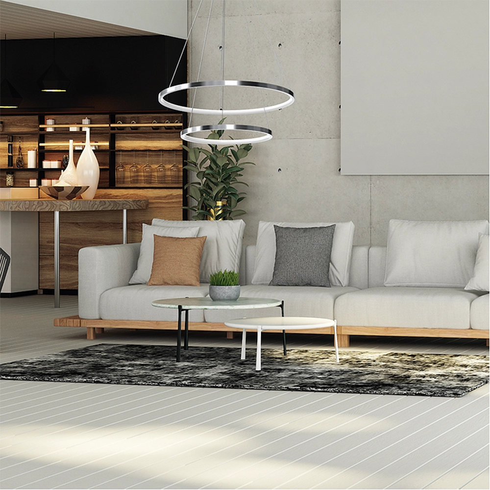 - Nowoczesny Salon i Strefa Wypoczynku: W dużych pokojach dziennych HOOP pełni rolę centralnego punktu wizualnego. Jej chromowana powierzchnia pięknie odbija kolory otoczenia, a moc 51W gwarantuje, że wieczorne czytanie czy rodzinne gry planszowe będą komfortowe dla wzroku.