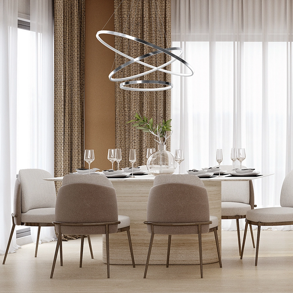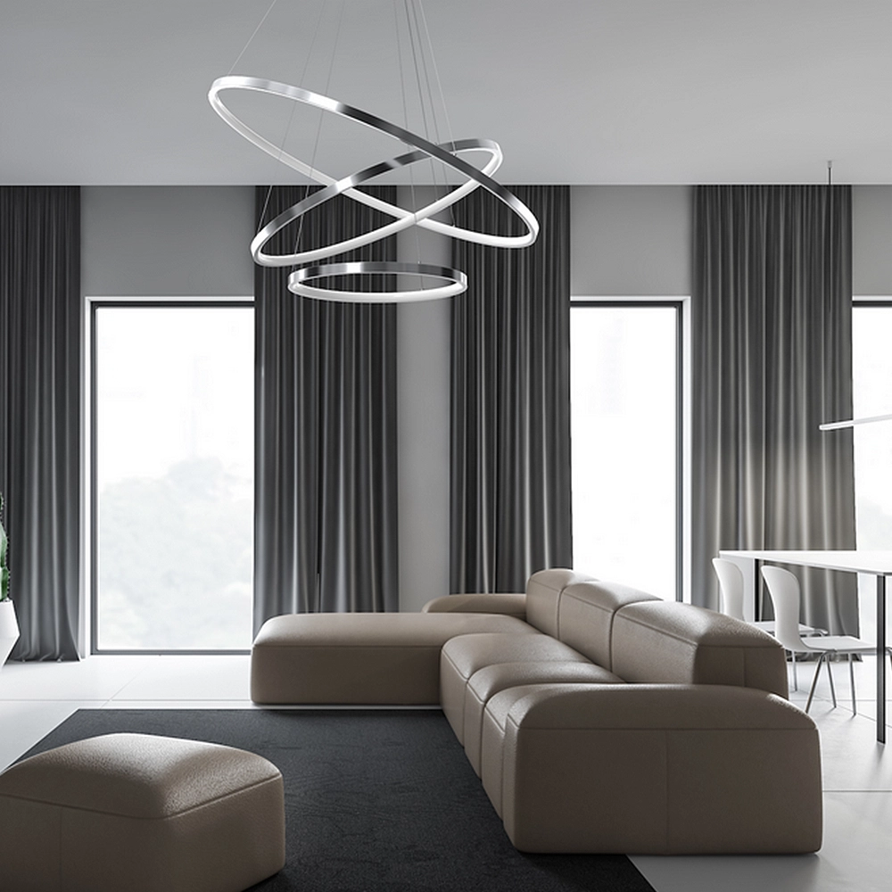 Model HOOP został zaprojektowany z myślą o otwartych przestrzeniach, w których światło odgrywa rolę architektoniczną. Dzięki wykończeniu w lustrzanym chromie, lampa ta nie tylko emituje światło, ale również subtelnie odbija otoczenie, wtapiając się w aranżację.