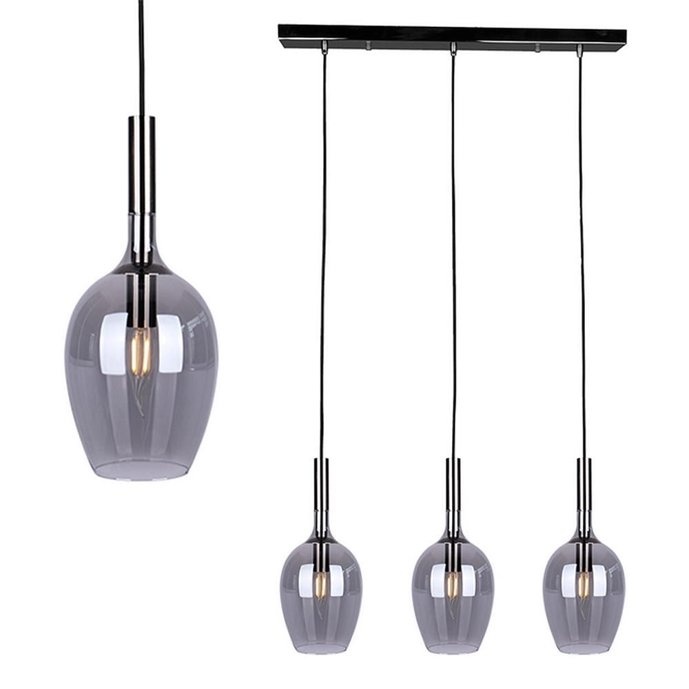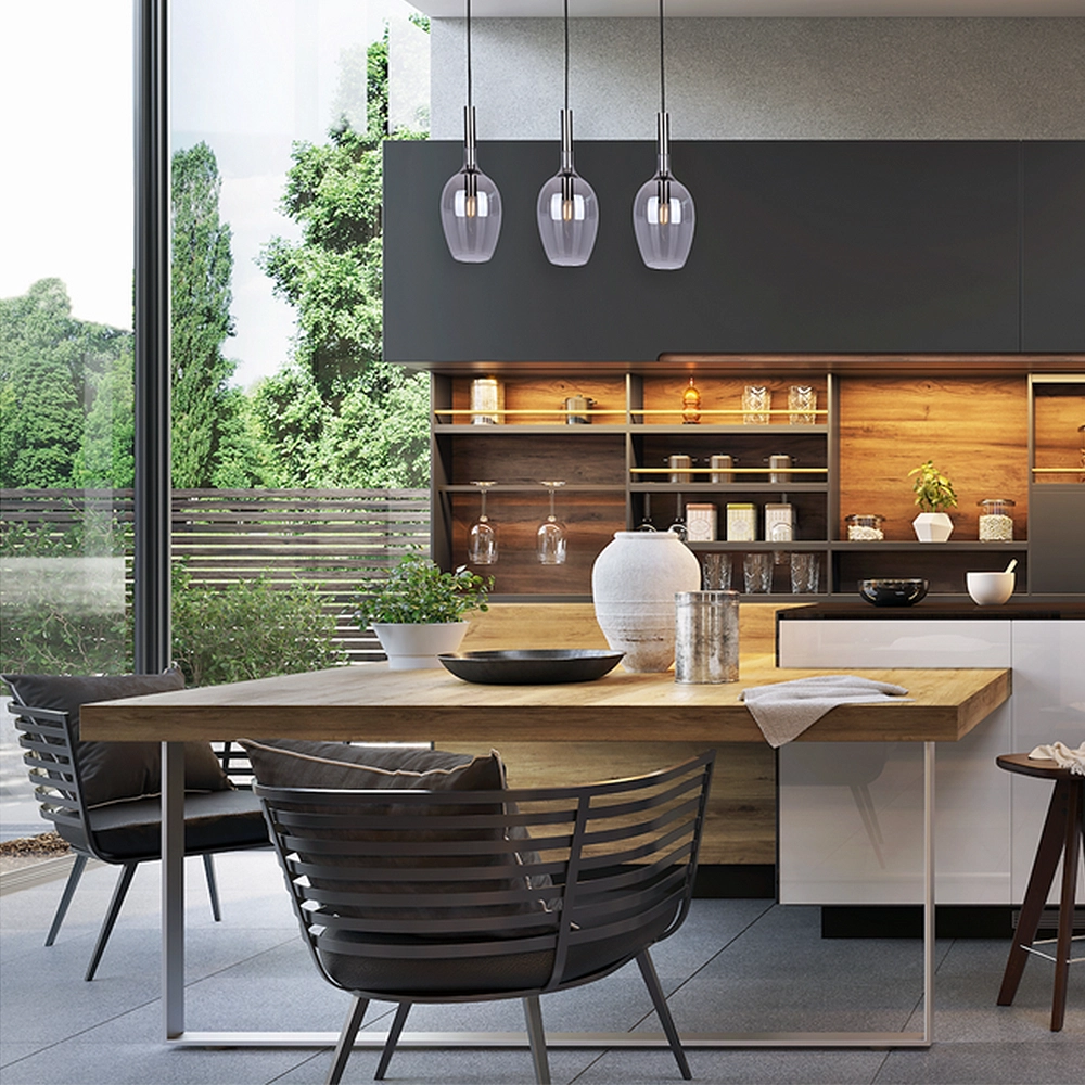 - Główne oświetlenie salonu: W pomieszczeniach o metrażu 15-25 m², gdzie jedna żarówka to za mało, potrójne LUGANO zapewnia wystarczającą ilość lumenów, zachowując przy tym intymny charakter dzięki efektowi Smoked Glass.