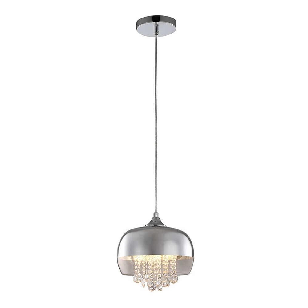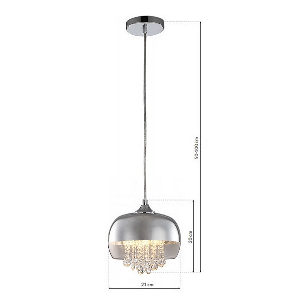 Nie, i to jest największy atut tego modelu. Zastosowana technologia napylania chromu na szkło sprawia, że klosz jest półtransparentny. Gdy lampa jest wyłączona, wygląda jak lite, nieprzezroczyste lustro. Jednak po zaświeceniu, powłoka staje się delikatnie przezroczysta, pozwalając światłu przenikać przez ścianki klosza. Dzięki temu zyskujesz nie tylko mocny strumień światła skierowany w dół (np. na stół), ale też przyjemną, nastrojową poświatę, która delikatnie rozświetla całe pomieszczenie bez efektu oślepienia.