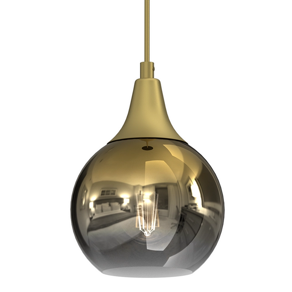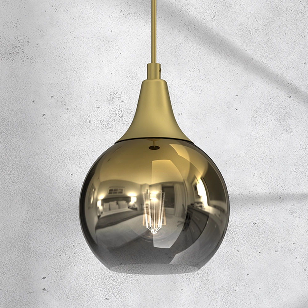 - Oświetlenie nad wyspą kuchenną (Układ szeregowy): Dzięki niewielkiej średnicy (150 mm), lampa idealnie nadaje się do montażu w grupach (np. 2 lub 3 sztuki obok siebie). Złoty kolor subtelnie odbija światło kuchenne, dodając wnętrzu ciepła, a możliwość skrócenia przewodu do 30 cm pozwala na bezpieczne zawieszenie lampy tak, by nie przeszkadzała w codziennych pracach domowych.