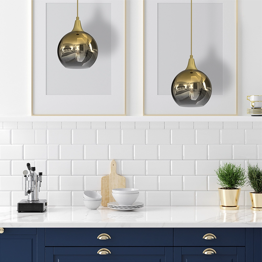 - Nad wyspą kuchenną lub stołem w jadalni: Zamontuj 2 lub 3 lampy obok siebie na różnych wysokościach. Złote wykończenie będzie pięknie korespondować z armaturą kuchenną lub zastawą stołową, tworząc spójną strefę spotkań.