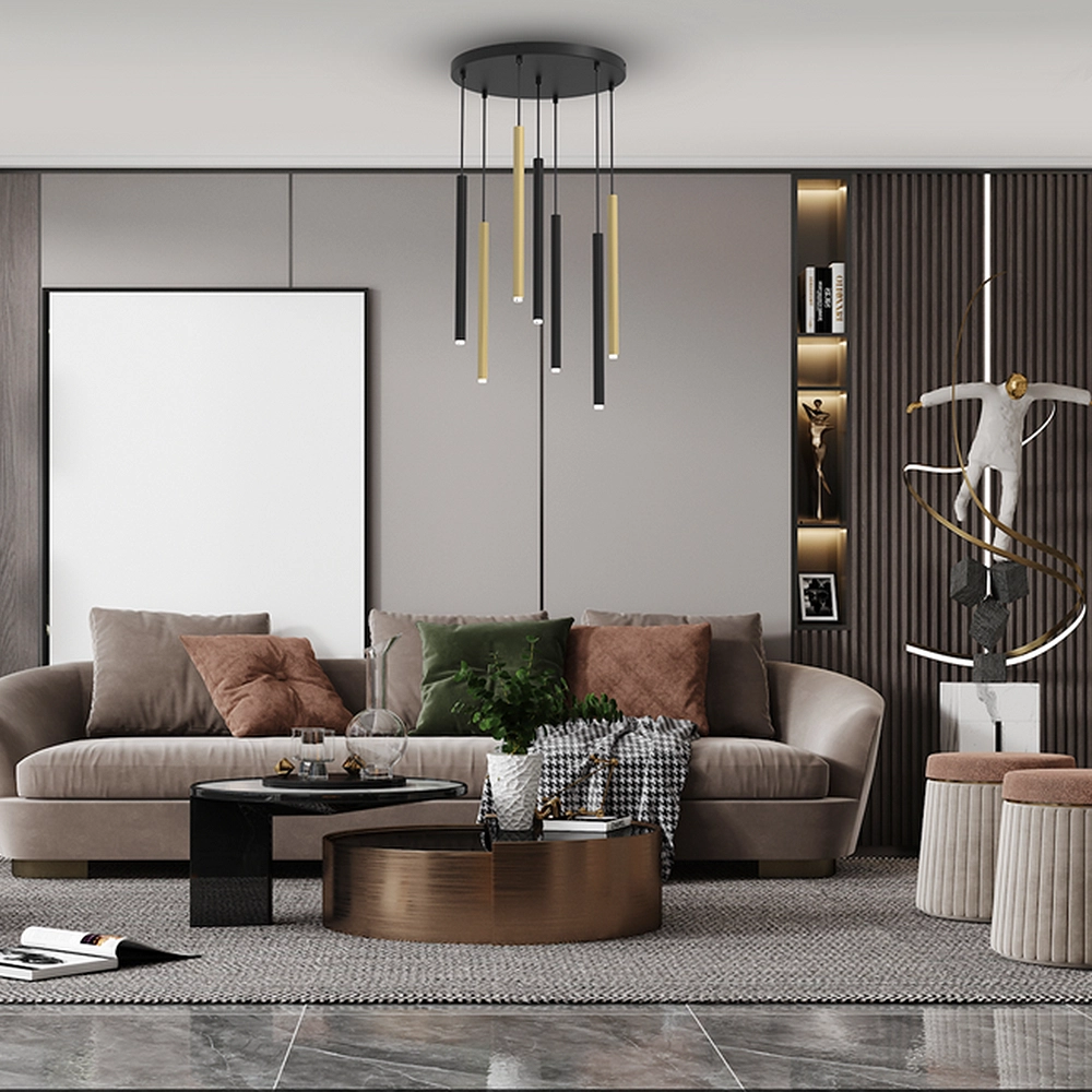 - Reprezentacyjny salon: Połączenie matowej czerni z połyskującym złotem doskonale współgra z popularnymi w 2026 roku materiałami wykończeniowymi, takimi jak lamele ścienne, beton architektoniczny czy naturalne drewno orzechowe.
