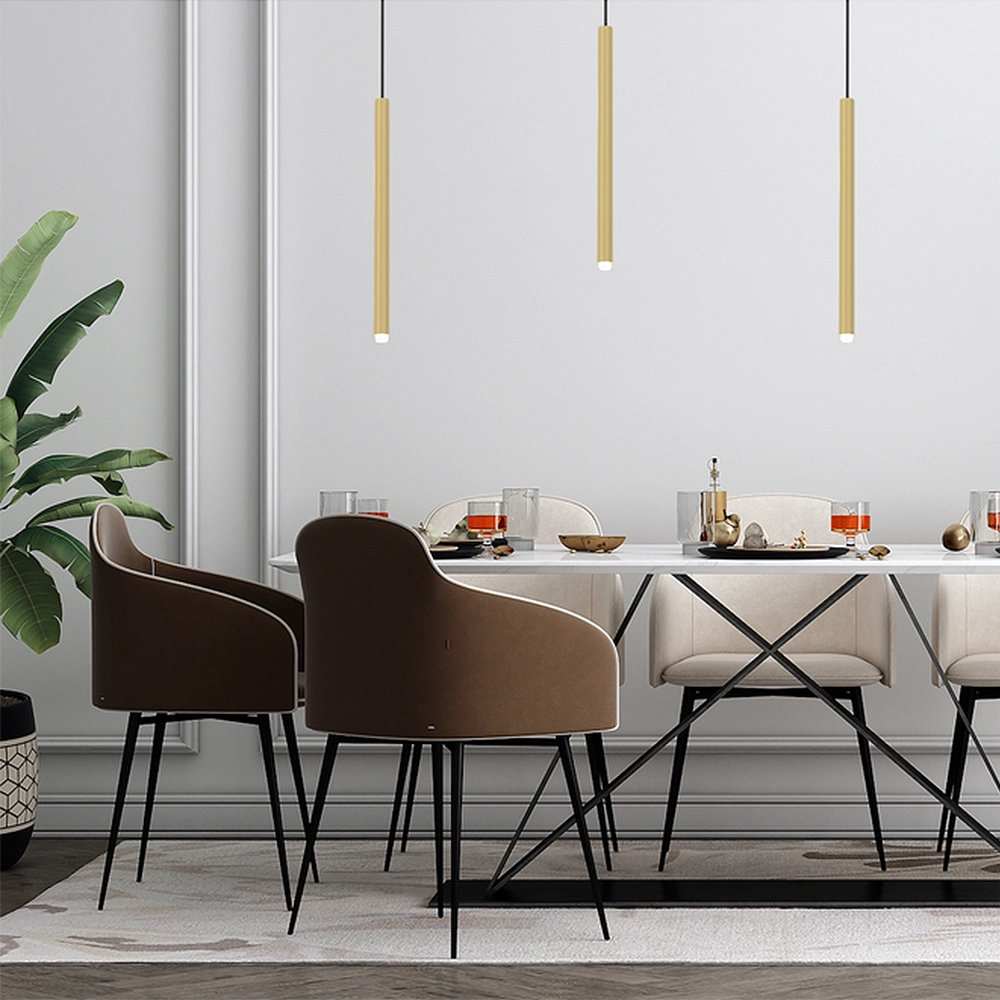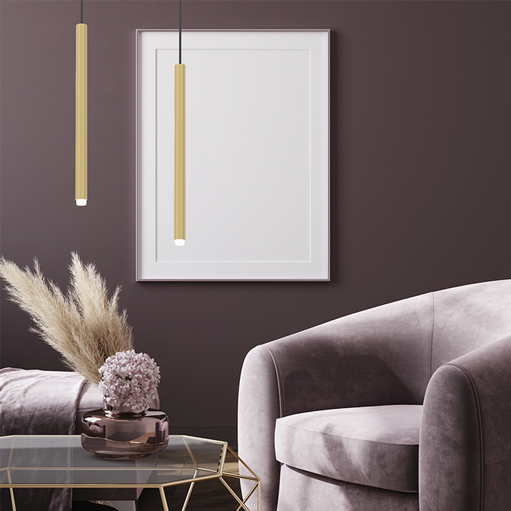 - Nad wyspą kuchenną lub barkiem: Zastosowanie 2-3 sztuk w linii pozwala na stworzenie profesjonalnej strefy roboczej i jadalnianej. Złoty kolor metalu pięknie koresponduje z blatami z kamienia, konglomeratu czy ciemnego drewna.