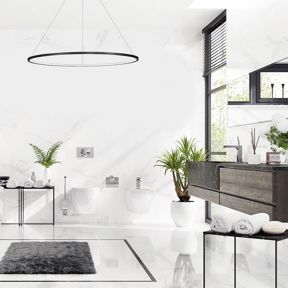 - Łazienki i domowe strefy SPA: To jeden z niewielu modeli wiszących typu "ring", który posiada certyfikat IP44. Możesz ją bezpiecznie zamontować w pobliżu wanny lub umywalki (w strefach narażonych na wilgoć), dodając łazience luksusowego, loftowego charakteru.