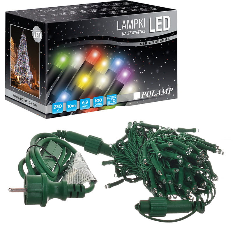 Lampki choinkowe LED do zastosowania zarówno na zewnątrz jak i do wewnątrz z kolekcji srebrnej z 100 diodami LED o długości 10mb. Lampki świąteczne znajdują zastosowanie szczególnie do ozdabiania choinek, okien, aranżacji wewnętrznej i zewnętrznej oraz do dowolnego oświetlenia świątecznego. Występują w wielu kolorach świecenia.