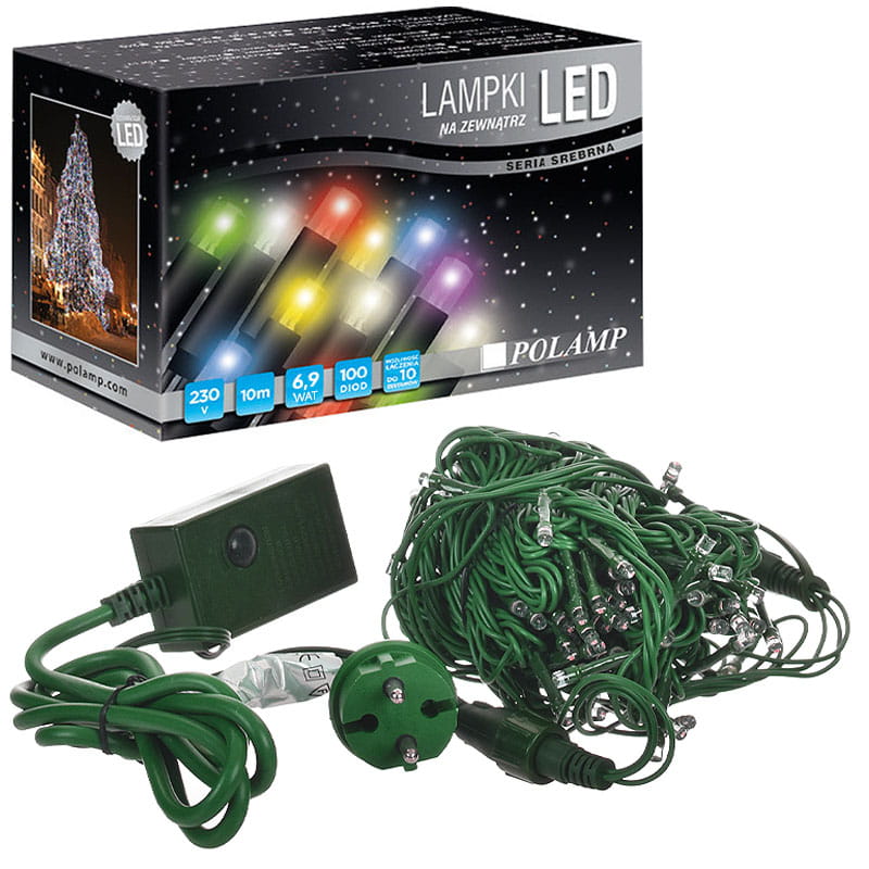 Lampki choinkowe LED z programatorem do zastosowania zarówno na zewnątrz jak i wewnątrz z kolekcji srebrnej z 100 diodami LED o długości 10mb. Lampki świąteczne znajdują zastosowanie szczególnie do ozdabiania choinek, okien, aranżacji wewnętrznej i zewnętrznej oraz do dowolnego oświetlenia świątecznego. Występują w wielu kolorach świecenia. Posiadają na wyposażeniu programator z 8 różnymi funkcjami świecenia.