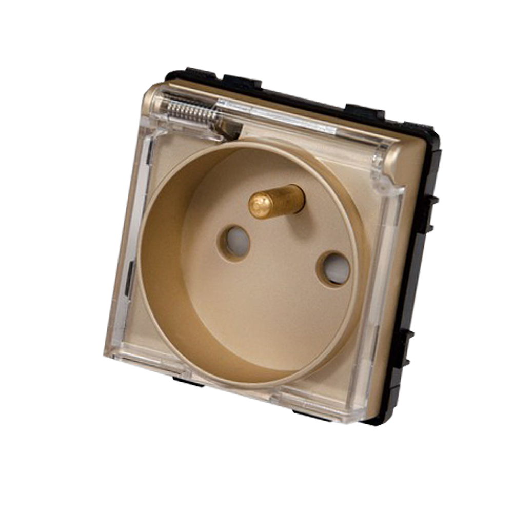 Moduł gniazda elektrycznego z bolcem i klapką 16A złoty - TM6252G - TOUCHME, to funkcjonalny element przeznaczony do szklanych oraz aluminiowych ramek z serii Touchme. Gniazdko elektryczne umożliwia doprowadzenie energii elektrycznej do podłączonych odbiorników, zapewniając dostęp do sieci elektrycznej dla urządzeń przeznaczonych na napięcie 230V. Pozwala to na zwiększenie funkcjonalności instalacji elektrycznej oraz jej poszerzenie. Wbudowana przeźroczysta klapka zapewnia ochronę przed wilgocią na poziomie IP44.
