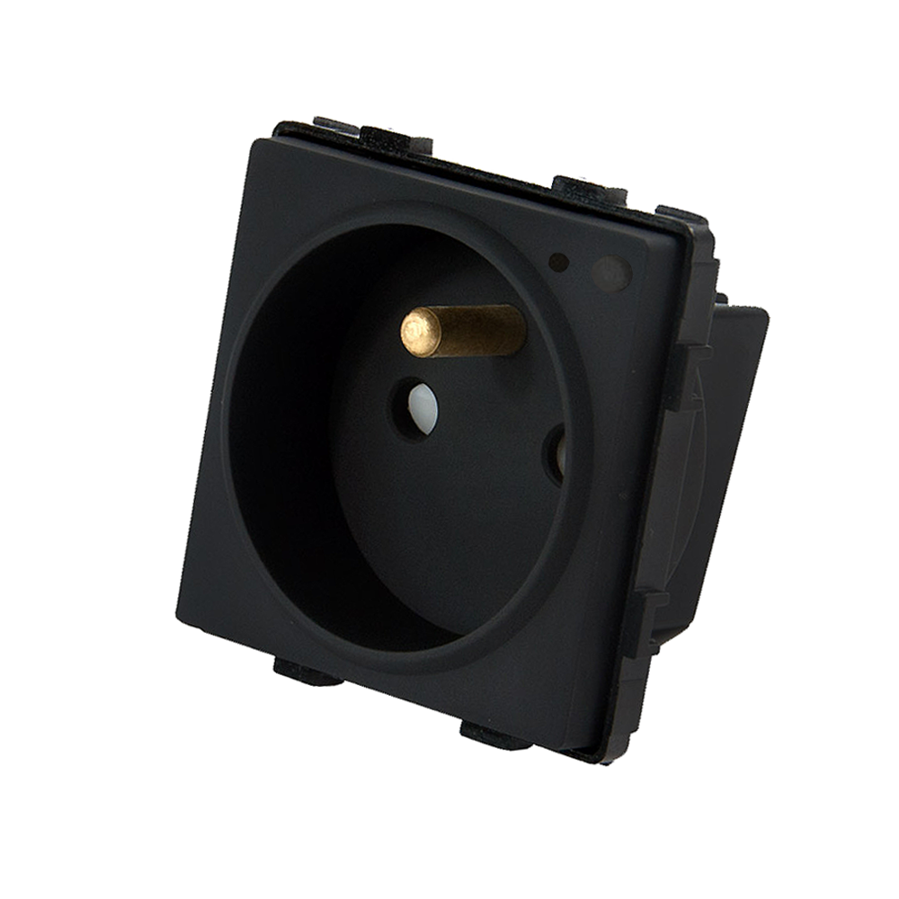 Moduł gniazda elektrycznego z bolcem i przyciskiem 16A czarny - TM637B - TOUCHME, to funkcjonalny element przeznaczony do szklanych oraz aluminiowych ramek z serii Touchme. Gniazdko elektryczne umożliwia doprowadzenie energii elektrycznej do podłączonych odbiorników, zapewniając dostęp do sieci elektrycznej dla urządzeń przeznaczonych na napięcie 230V. Pozwala to na zwiększenie funkcjonalności instalacji elektrycznej oraz jej poszerzenie.