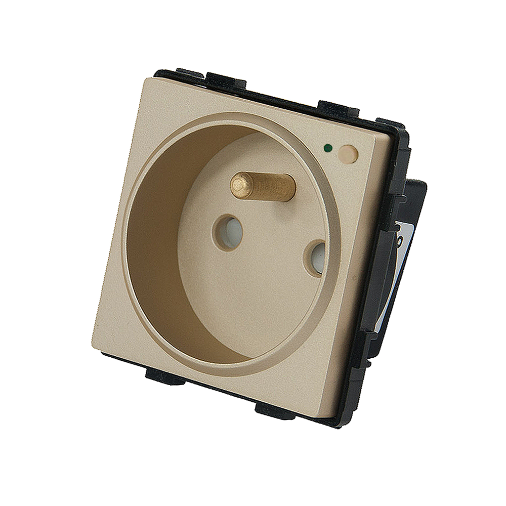 Moduł gniazda elektrycznego z bolcem i przyciskiem - WiFi - 16A złoty - TM635G - TOUCHME, to funkcjonalny element przeznaczony do szklanych oraz aluminiowych ramek z serii Touchme. Gniazdko elektryczne umożliwia doprowadzenie energii elektrycznej do podłączonych odbiorników, zapewniając dostęp do sieci elektrycznej dla urządzeń przeznaczonych na napięcie 230V. Pozwala to na zwiększenie funkcjonalności instalacji elektrycznej oraz jej poszerzenie.