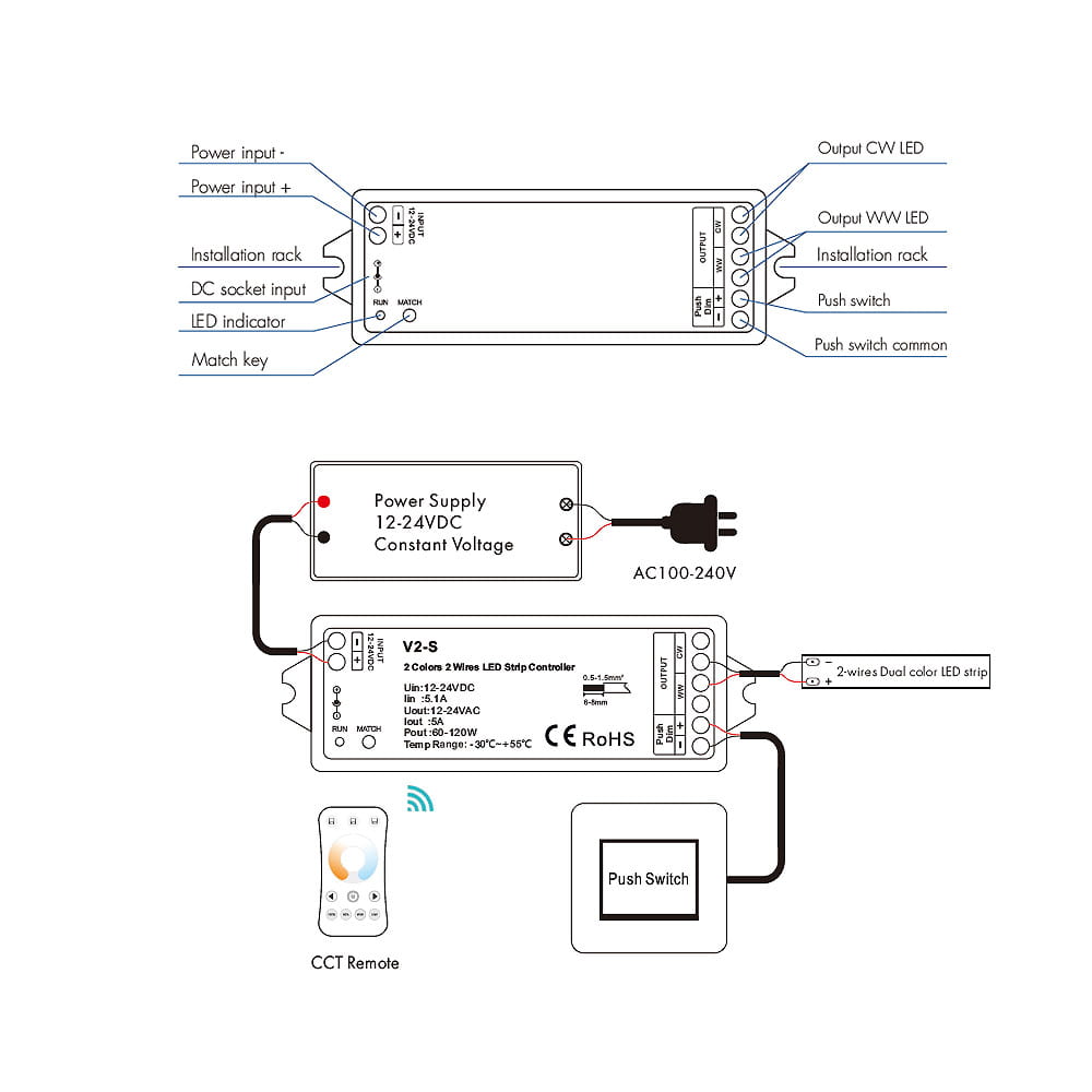 To urządzenie odbiorcze, służące do uzyskania kontroli nad oświetleniem LED ze zmienną temperaturą barwową która posiada dwa przewody do podłączenia (np. taśma LED CCT 2-wires) bez pomocy dodatkowych urządzeń. Odbiornik V2-S umożliwia dostęp do dwóch wyjść, do którego podłączone oświetlenie led może być dowolnie ściemniane/rozjaśniane oraz sterowane w zakresie temperatury barwowej 2700-6500K za pomocą sygnału PWM. Podstawową formą komunikacji odbiornika V2-S jest bezprzewodowa droga radiowa, którą łączy się z pilotem do led bądź panelem naściennym led.
