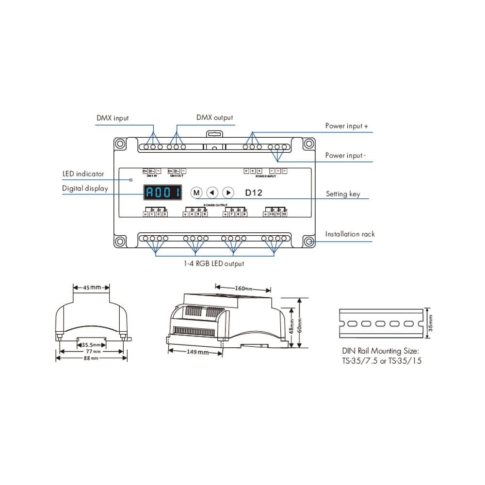 Odbiornik LED DMX512 - 24 kanałowy - 12-24V DC 12x5A - na szynę DIN - Dekoder DMX - D24, to urządzenie odbiorcze posiadające wbudowane dwadzieścia cztery kanały dla których możemy określić indywidualne cyfrowe adresy i uzyskać dostęp do sterowania np. wielokolorowym oświetleniem LED. Sterowanie w przypadku dekoderów opartych o system DMX definiuje się jako zmiana jasności, koloru RGB czy temperatury barwowej CCT, bowiem każde wyjście może otrzymać przypisaną cechę do której dostęp będzie realizowany wykorzystując jego uprzednio ustalony adres. Uzyskanie kontroli nad dekoderem możliwe jest poprzez otrzymanie sygnału cyfrowego DMX512, który jest dekodowany i przetwarzany na sygnał PWM, umożliwiający podłączenie np. taśmy LED RGB. Odbiornik DMX512 D24 pozwala na obciążenie maksymalnie dwudziestu czterech wyjść prądem o wartości 5A (kanał) przy napięciu znamionowym 12-24VDC. Ze względu na zastosowanie protokołu RDM istnieje możliwość ustalenia adresu dekodera przy użyciu nadajnika DMX512 (np. konsoli) bądź z poziomu samego dekodera wykorzystując dostępny wyświetlacz LCD. Montaż dekodera D24 przeznaczony jest na szynę instalatorską DIN - TH-35.