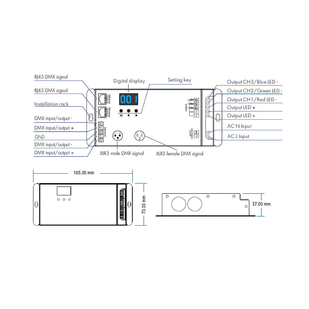 Odbiornik LED DMX512 - 3 kanałowy - 230V AC 3x1,5A - Dekoder DMX - S3-DX, to urządzenie odbiorcze posiadające wbudowane trzy kanały dla których możemy określić indywidualne cyfrowe adresy i uzyskać dostęp do sterowania np. wielokolorowym oświetleniem LED RGB. Sterowanie w przypadku dekoderów opartych o system DMX definiuje się jako zmiana jasności, koloru RGB czy temperatury barwowej CCT, bowiem każde wyjście może otrzymać przypisaną cechę do którego dostęp będzie realizowany wykorzystując jego uprzednio ustalony adres. Uzyskanie kontroli nad dekoderem możliwe jest poprzez otrzymanie sygnału cyfrowego DMX512, który jest dekodowany i przetwarzany na sygnał PWM, umożliwiający podłączenie np. taśmy LED RGB. Odbiornik DMX512 S3-DX pozwala na obciążenie maksymalnie trzech wyjść prądem o wartości 1,5A przy napięciu znamionowym 230VAC. Ze względu na zastosowanie protokołu RDM istnieje możliwość ustalenia adresu dekodera przy użyciu nadajnika DMX512 (np. konsoli) bądź z poziomu samego dekodera wykorzystując dostępny wyświetlacz LCD. Dodatkowo odbiornik posiada w swojej budowie wejścia na dwa sygnały realizowane poprzez port RJ45 oraz XLR3.