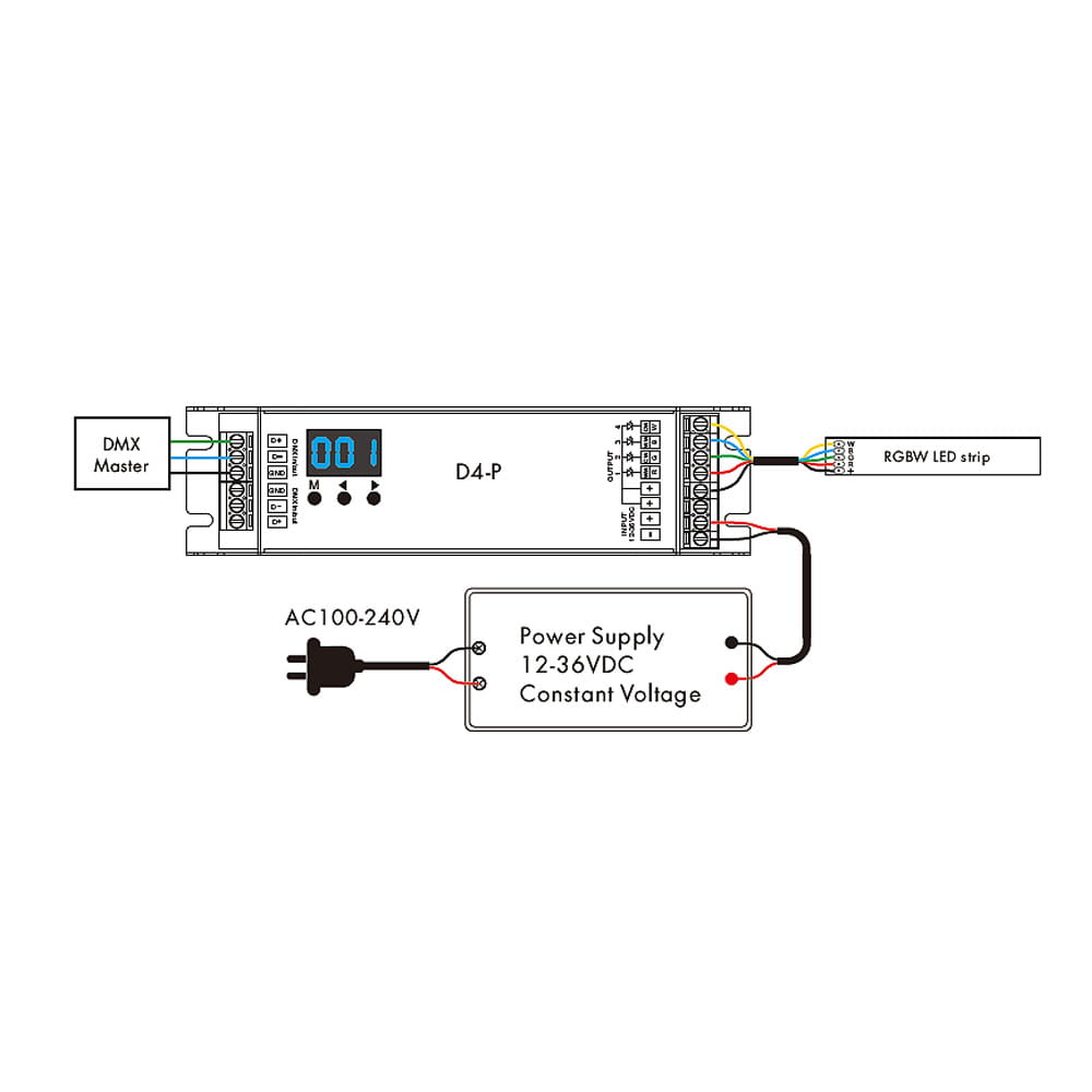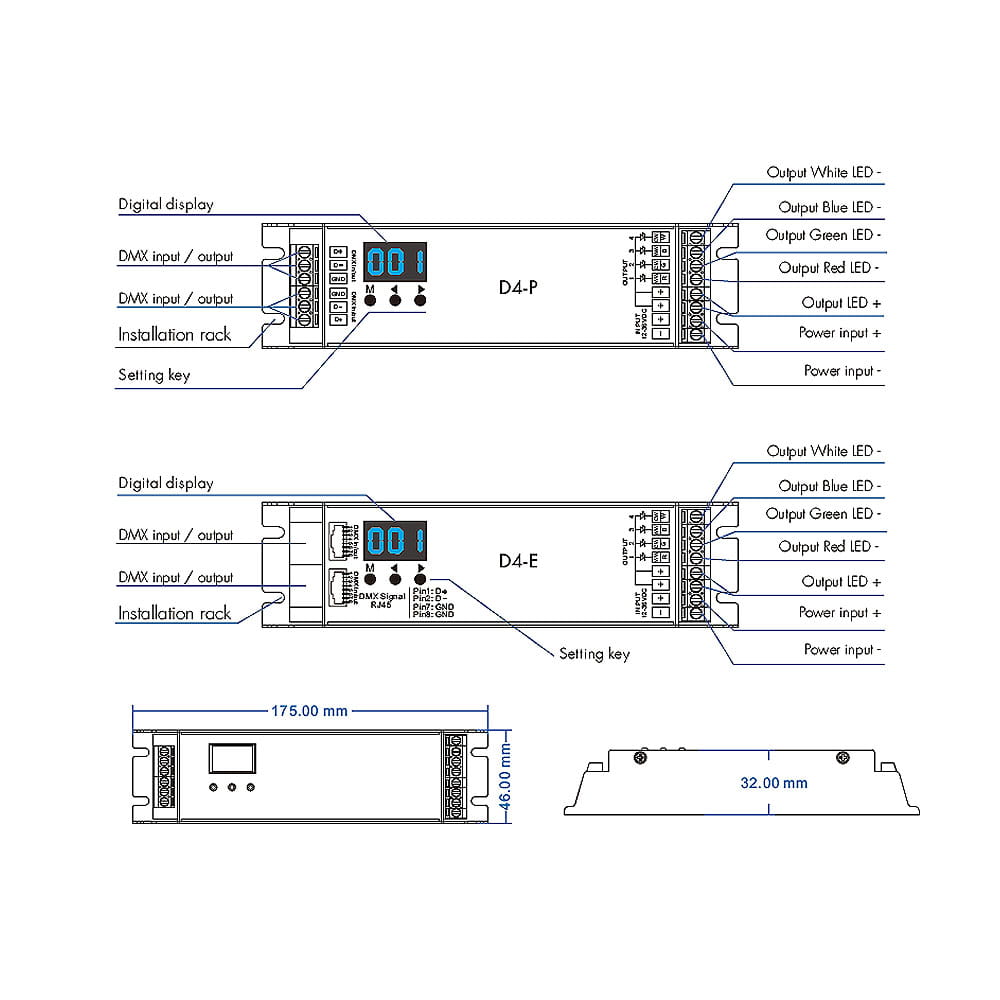 Odbiornik LED DMX512 - 4 kanałowy - 12-48V DC 4x8A - RJ45 - Dekoder DMX - D4-E, to urządzenie odbiorcze posiadające wbudowane cztery kanały dla których możemy określić indywidualne cyfrowe adresy i uzyskać dostęp do sterowania np. wielokolorowym oświetleniem LED. Sterowanie w przypadku dekoderów opartych o system DMX definiuje się jako zmiana jasności, koloru RGB czy temperatury barwowej CCT, bowiem każde wyjście może otrzymać przypisaną cechę do którego dostęp będzie realizowany wykorzystując jego uprzednio ustalony adres. Uzyskanie kontroli nad dekoderem możliwe jest poprzez otrzymanie sygnału cyfrowego DMX512, który jest dekodowany i przetwarzany na sygnał PWM, umożliwiający podłączenie np. taśmy LED RGB. Odbiornik DMX512 D4-E pozwala na obciążenie maksymalnie czterech wyjść prądem o wartości 32A przy napięciu znamionowym 12-48VDC. Ze względu na zastosowanie protokołu RDM istnieje możliwość ustalenia adresu dekodera przy użyciu nadajnika DMX512 (np. konsoli) bądź z poziomu samego dekodera wykorzystując dostępny wyświetlacz LCD.