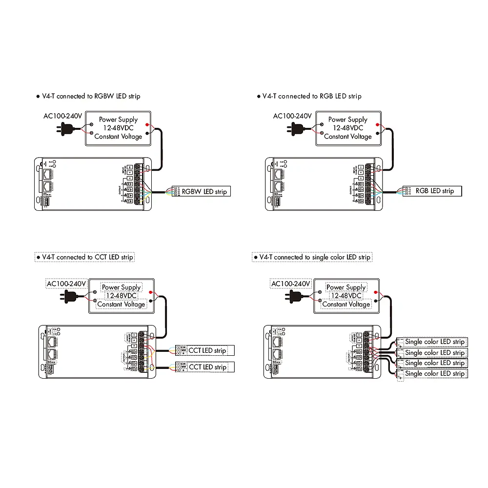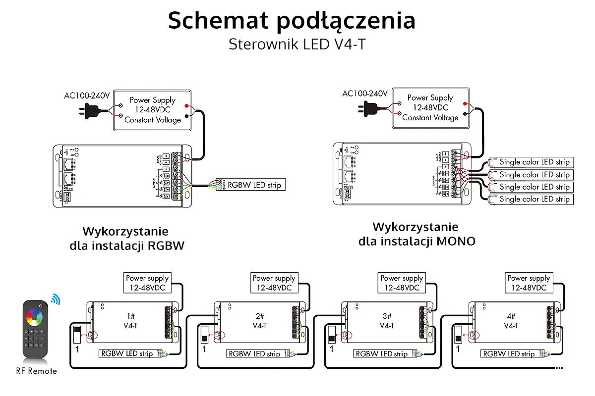 To urządzenie odbiorcze, służące do uzyskania kontroli nad wielokolorowym oświetleniem LED wraz z dodatkową barwą białą (np. taśma LED RGB+W) Sterownik V4-T umożliwia dostęp do czerech wyjść, do których podłączone oświetlenie led może być dowolnie ściemniane/rozjaśniane oraz sterowane w zakresie palety kolorów RGB, a za pomocą sygnału PWM dodatkowo możemy uzyskać kontrole nad samą barwą monochromatyczną. Ze względu na swoją uniwersalność, odbiornik led może być zastosowany do innych instalacji LED - monochromatycznych MONO, ze zmienną temperaturą barwową CCT czy wielokolorową RGB. Podstawową formą komunikacji odbiornika V4-T jest bezprzewodowa droga radiowa, którą łączy się z pilotem do led bądź panelem naściennym led.