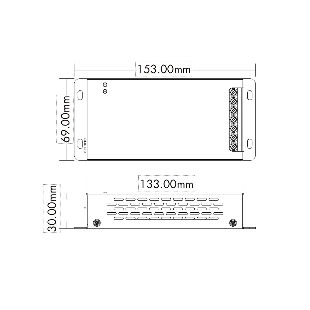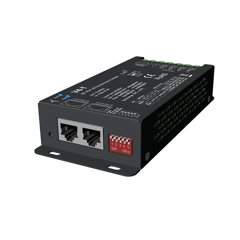 Odbiornik V4-T wyróżnia się zakresem szerokim napięcia wejściowego rzędu 12-48V, mocą wyjściową rzędu 32A oraz płynną regulowaną pracą ściemniania PWM, co jest niezmiernie ważne dla zdrowia naszych oczu. Odbiornik posiada w obudowie złącza RJ45 pozwalające na szybkie wykorzystanie sieci DMX512 w celu zsynchronizowania pracy sterowników LED. Wysoka jakość wykonania natomiast zapewnia 60-cio miesięczny okres gwarancyjny.