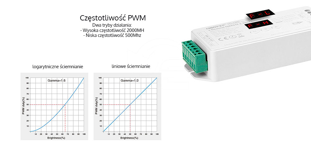 - Możliwość wyboru dwóch trybów pracy częstotliwości PWM