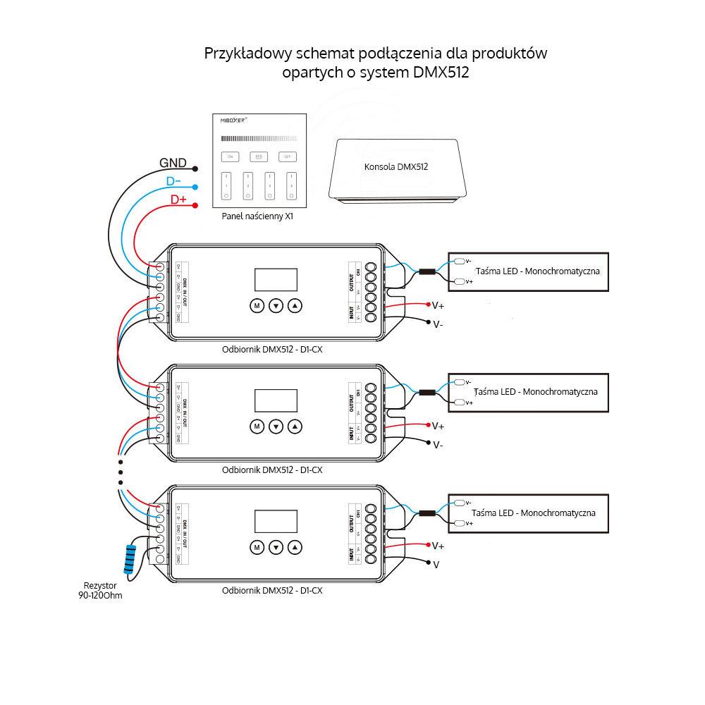 Odbiornik LED – RGB – 12-24V 18A – DMX512 – D3-CX, to produkt umożliwiający przewodowe sterowanie wielokolorowym oświetleniem LED. Urządzenie zostało skonstruowane w sposób, pozwalający na zastosowanie go systemie sterowania DMX512. Posiada wbudowany wyświetlacz cyfrowy ukazujący aktualny adres DMX, na którym się znajdujemy. Odbiornik w systemie DMX można zsynchronizować z istniejącą już instalacją oświetlenia LED, bazującą na produktach MiBoxer (MiLight) wykorzystującą drogę radiową o częstotliwości 2,4Ghz