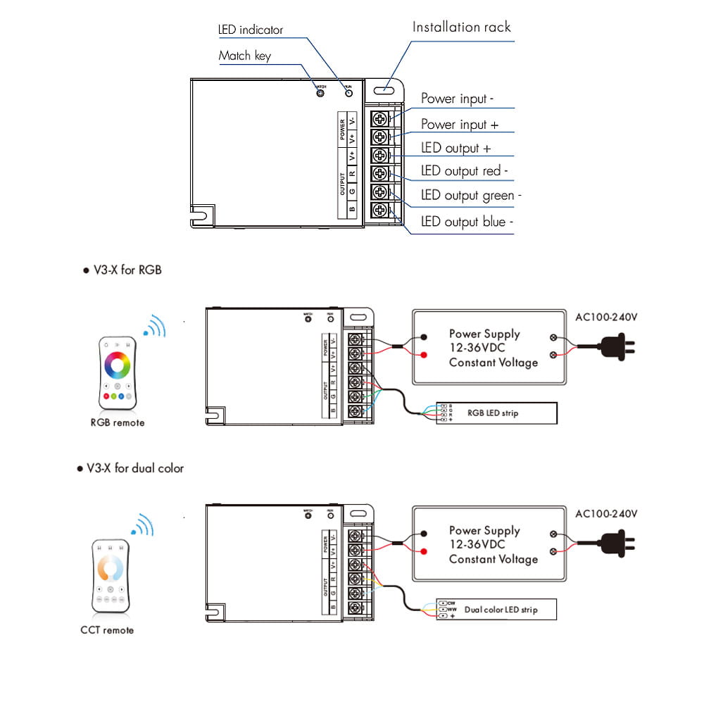 To urządzenie odbiorcze, służące do uzyskania kontroli nad wielokolorowym oświetleniem LED (np. taśma LED RGB) Odbiornik V3-X umożliwia dostęp do trzech wyjść, do których podłączone oświetlenie led może być dowolnie ściemniane/rozjaśniane oraz sterowane w zakresie palety barw RGB za pomocą sygnału PWM. Podstawową formą komunikacji odbiornika V3-X jest bezprzewodowa droga radiowa, którą łączy się z pilotem do led bądź panelem naściennym led.
