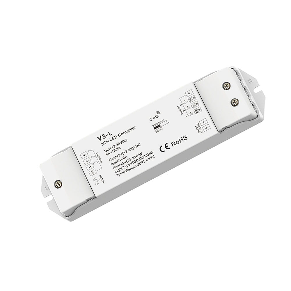 To urządzenie odbiorcze, służące do uzyskania kontroli nad wielokolorowym oświetleniem LED (np. taśma LED RGB) Odbiornik V3-L umożliwia dostęp do trzech wyjść, do których podłączone oświetlenie led może być dowolnie ściemniane/rozjaśniane oraz sterowane w zakresie palety barw RGB za pomocą sygnału PWM. Podstawową formą komunikacji odbiornika V3-L jest bezprzewodowa droga radiowa, którą łączy się z pilotem do led oraz panelem naściennym led, natomiast odbiornik led został wzbogacony o dodatkowe niezależne wejścia bezpotencjałowe, umożliwiające ściemnianie/rozjaśnianie oraz zmianę koloru przy użyciu przycisku zwiernego dla każdego wyjścia osobno.