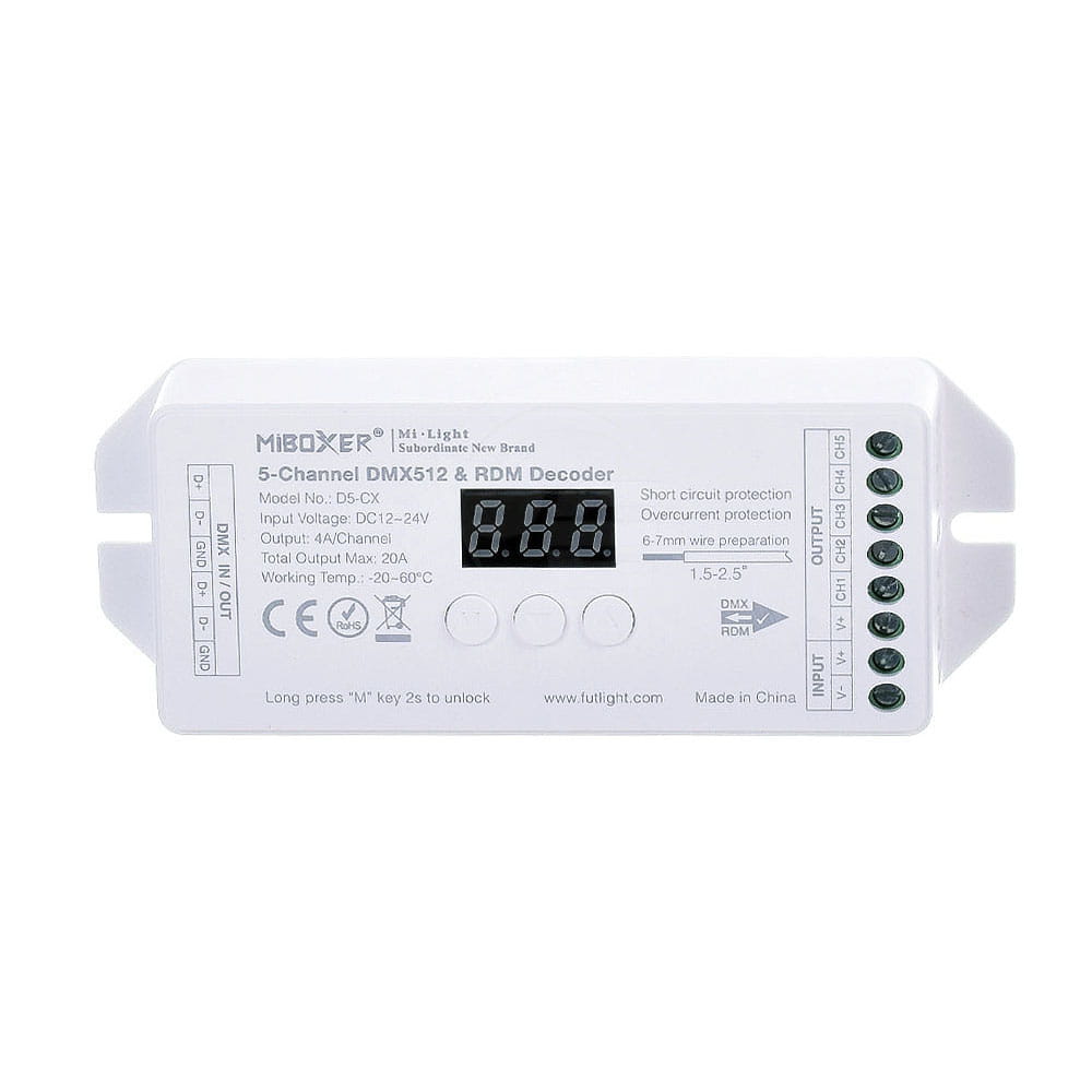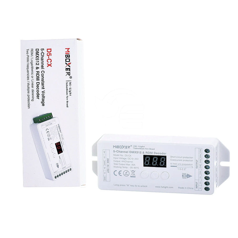 Odbiornik LED – RGB+CCT – 12-24V 20A – DMX512 – D5-CX, to produkt umożliwiający przewodowe sterowanie wielokolorowym oświetleniem LED z możliwością zmiany temperatury barwowej. Urządzenie zostało skonstruowane w sposób, pozwalający na zastosowanie go systemie sterowania DMX512. Posiada wbudowany wyświetlacz cyfrowy ukazujący aktualny adres DMX, na którym się znajdujemy. Odbiornik w systemie DMX można zsynchronizować z istniejącą już instalacją oświetlenia LED, bazującą na produktach MiBoxer (MiLight) wykorzystującą drogę radiową o częstotliwości 2,4Ghz