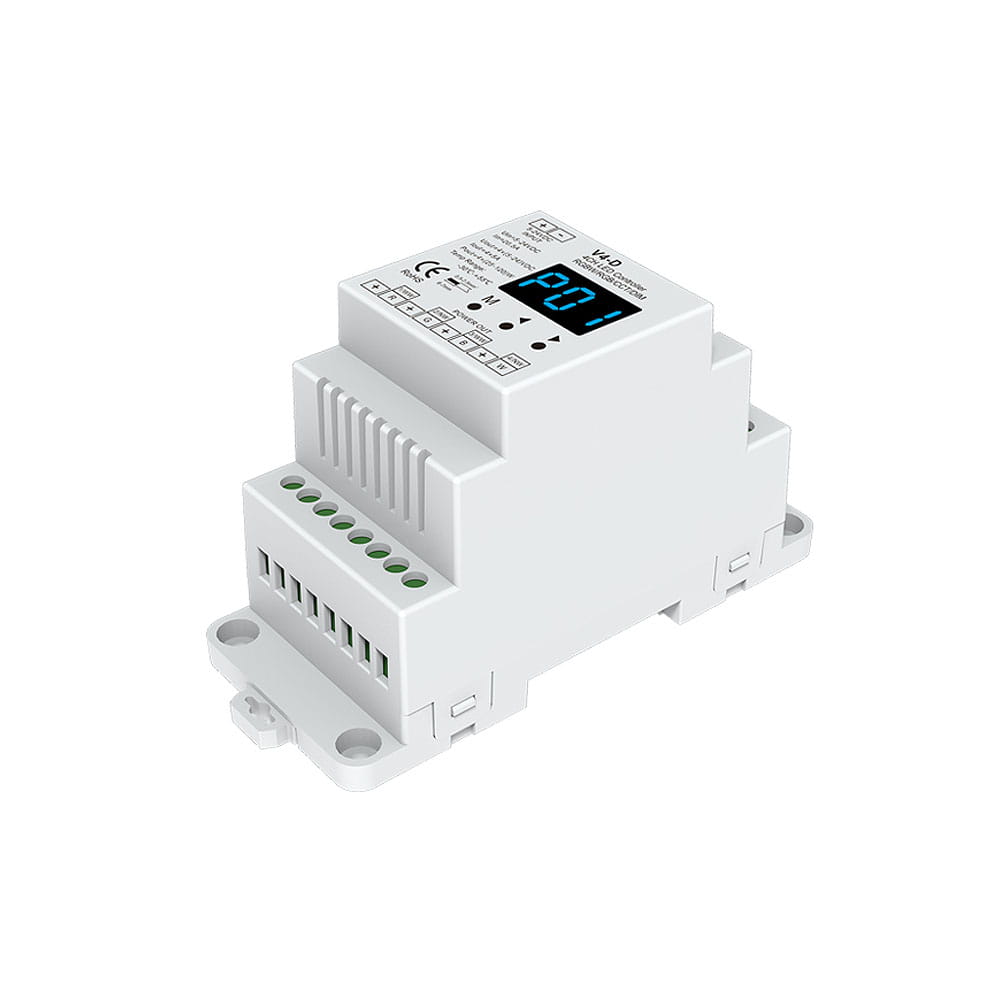 To urządzenie odbiorcze, służące do uzyskania kontroli nad wielokolorowym oświetleniem LED wraz z dodatkową barwą białą (np. taśma LED RGB+W) Odbiornik V4-D umożliwia dostęp do czerech wyjść, do których podłączone oświetlenie led może być dowolnie ściemniane/rozjaśniane oraz sterowane w zakresie palety kolorów RGB za pomocą sygnału PWM a dodatkowo możemy uzyskać kontrole nad samą barwą monochromatyczną oraz ze zmienną temperaturą barwową CCT. Istotną cechą wyróżniającą się na tle innych odbiorników jest możliwość ustalenia krzywej ściemniania oraz częstotliwości sygnału PWM. Podstawową formą komunikacji odbiornika V4-D jest bezprzewodowa droga radiowa, którą łączy się z pilotem do led bądź panelem naściennym led. Odbiornik przeznaczony jest do montażu na szynę instalacyjną TH-35 (DIN).